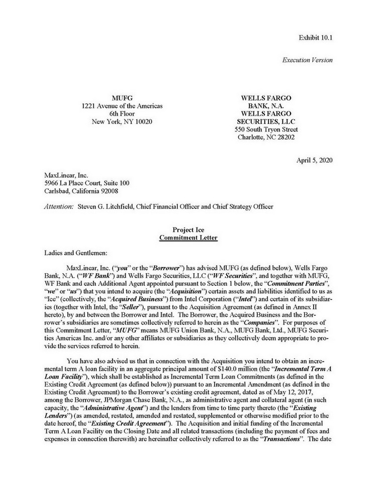 Exhibit 10.1Execution VersionMUFG 1221 Avenue of the Americas 6th Floor New York, NY 10020WELLS FARGO BANK, N.A. WELLS FARGO SECURITIES, LLC 550 South Tryon Street Charlotte, NC 28202April 5, 2020MaxLinear, Inc. 5966 La Place Court, Suite 100 Carlsbad, California 92008Attention: Steven G. Litchfield, Chief Financial Officer and Chief Strategy OfficerProject Ice Commitment LetterLadies and Gentlemen:MaxLinear, Inc. (“you” or the “Borrower”) has advised MUFG (as defined below), Wells Fargo Bank, N.A. (“WF Bank”) and Wells Fargo Securities, LLC (“WF Securities”, and together with MUFG, WF Bank and each Additional Agent appointed pursuant to Section 1 below, the “Commitment Parties”, “we” or “us”) that you intend to acquire (the “Acquisition”) certain assets and liabilities identified to us as “Ice” (collectively, the “Acquired Business”) from Intel Corporation (“Intel”) and certain of its subsidiar- ies (together with Intel, the “Seller”), pursuant to the Acquisition Agreement (as defined in Annex II hereto), by and between the Borrower and Intel. The Borrower, the Acquired Business and the Bor- rower’s subsidiaries are sometimes collectively referred to herein as the “Companies”. For purposes of this Commitment Letter, “MUFG” means MUFG Union Bank, N.A., MUFG Bank, Ltd., MUFG Securi- ties Americas Inc. and/or any other affiliates or subsidiaries as they collectively deem appropriate to pro- vide the services referred to herein.You have also advised us that in connection with the Acquisition you intend to obtain an incre- mental term A loan facility in an aggregate principal amount of $140.0 million (the “Incremental Term A Loan Facility”), which shall be established as Incremental Term Loan Commitments (as defined in the Existing Credit Agreement (as defined below)) pursuant to an Incremental Amendment (as defined in the Existing Credit Agreement) to the Borrower’s existing credit agreement, dated as of May 12, 2017, among the Borrower, JPMorgan Chase Bank, N.A., as administrative agent and collateral agent (in such capacity, the “Administrative Agent”) and the lenders from time to time party thereto (the “Existing Lenders”) (as amended, restated, amended and restated, supplemented or otherwise modified prior to the date hereof, the “Existing Credit Agreement”). The Acquisition and initial funding of the Incremental Term A Loan Facility on the Closing Date and all related transactions (including the payment of fees and expenses in connection therewith) are hereinafter collectively referred to as the “Transactions”. The date