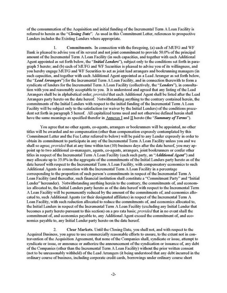 of the consummation of the Acquisition and initial funding of the Incremental Term A Loan Facility is referred to herein as the “Closing Date”. As used in this Commitment Letter, references to prospective Lenders includes the Existing Lenders where appropriate.1. Commitments. In connection with the foregoing, (a) each of MUFG and WF Bank is pleased to advise you of its several and not joint commitment to provide 50.0% of the principal amount of the Incremental Term A Loan Facility (in such capacities, and together with each Additional Agent appointed as set forth below, the “Initial Lenders”), subject only to the conditions set forth in para- graph 5 hereto; and (b) each of MUFG and WF Securities is pleased to advise you of its willingness, and you hereby engage MUFG and WF Securities to act as joint lead arrangers and bookrunning managers (in such capacities, and together with each Additional Agent appointed as a Lead Arranger as set forth below, the “Lead Arrangers”) for the Incremental Term A Loan Facility, and in connection therewith to form a syndicate of lenders for the Incremental Term A Loan Facility (collectively, the “Lenders”), in consulta- tion with you and reasonably acceptable to you. It is understood and agreed that any listing of the Lead Arrangers shall be in alphabetical order; provided that each Additional Agent shall be listed after the Lead Arrangers party hereto on the date hereof. Notwithstanding anything to the contrary contained herein, the commitments of the Initial Lenders with respect to the initial funding of the Incremental Term A Loan Facility will be subject only to the satisfaction (or waiver by the Initial Lenders) of the conditions prece- dent set forth in paragraph 5 hereof. All capitalized terms used and not otherwise defined herein shall have the same meanings as specified therefor in Annexes I and II hereto (the “Summary of Terms”).You agree that no other agents, co-agents, arrangers or bookrunners will be appointed, no other titles will be awarded and no compensation (other than compensation expressly contemplated by this Commitment Letter and the Fee Letter referred to below) will be paid to any Lender expressly in order to obtain its commitment to participate in any of the Incremental Term A Loan Facility unless you and we shall so agree; provided that at any time within ten (10) business days after the date hereof, you may ap- point up to two additional co-managers, agents, co-agents, arrangers, joint bookrunners or confer other titles in respect of the Incremental Term A Loan Facility (each such party, an “Additional Agent”) and may allocate up to 35.0% in the aggregate of the commitments of the Initial Lenders party hereto as of the date hereof with respect to the Incremental Term A Loan Facility, with compensatory economics to such Additional Agents in connection with the Incremental Term A Loan Facility in a percentage corresponding to the proportion of such person’s commitments in respect of the Incremental Term A Loan Facility (and thereafter, such financial institution shall constitute a “Commitment Party” and “Initial Lender” hereunder). Notwithstanding anything herein to the contrary, the commitments of, and econom- ics allocated to, the Initial Lenders party hereto as of the date hereof with respect to the Incremental Term A Loan Facility will be permanently reduced by the amount of the commitments of, and economics allo- cated to, such Additional Agents (or their designated affiliates) in respect of the Incremental Term A Loan Facility, with such reduction allocated to reduce the commitments of, and economics allocated to, the Initial Lenders in respect of the Incremental Term A Loan Facility (excluding any Initial Lender that becomes a party hereto pursuant to this section) on a pro rata basis; provided that in no event shall the commitment of, and economics payable to, any Additional Agent exceed the commitment of, and eco- nomics payable to, any Initial Lender party hereto on the date hereof.2. Clear Markets. Until the Closing Date, you shall not, and with respect to the Acquired Business, you agree to use commercially reasonable efforts to ensure, to the extent not in con- travention of the Acquisition Agreement, that none of the Companies shall, syndicate or issue, attempt to syndicate or issue, or announce or authorize the announcement of the syndication or issuance of, any debt of the Companies (other than the Incremental Term A Loan Facility) without the prior written consent (not to be unreasonably withheld) of the Lead Arrangers (it being understood that any debt incurred in the ordinary course of business, including corporate credit cards, borrowings under ordinary course short
