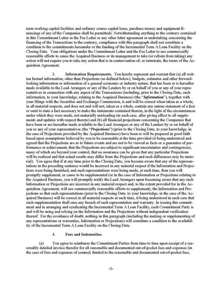 term working capital facilities and ordinary course capital lease, purchase money and equipment fi- nancings of any of the Companies shall be permitted). Notwithstanding anything to the contrary contained in this Commitment Letter or the Fee Letter or any other letter agreement or undertaking concerning the financing of the Transactions to the contrary, compliance with this paragraph shall not constitute a condition to the commitments hereunder or the funding of the Incremental Term A Loan Facility on the Closing Date. Your obligations under the Commitment Letter and the Fee Letter to use commercially reasonable efforts to cause the Acquired Business or its management to take (or refrain from taking) any action will not require you to take any action that is in contravention of, or terminate, the terms of the Ac- quisition Agreement.3. Information Requirements. You hereby represent and warrant that (a) all writ- ten factual information, other than Projections (as defined below), budgets, estimates and other forward- looking information or information of a general economic or industry nature, that has been or is hereafter made available to the Lead Arrangers or any of the Lenders by or on behalf of you or any of your repre- sentatives in connection with any aspect of the Transactions (including, prior to the Closing Date, such information, to your knowledge, relating to the Acquired Business) (the “Information”), together with your filings with the Securities and Exchange Commission, is and will be correct when taken as a whole, in all material respects, and does not and will not, taken as a whole, contain any untrue statement of a fact or omit to state a fact necessary to make the statements contained therein, in the light of the circumstances under which they were made, not materially misleading (in each case, after giving effect to all supple- ments and updates with respect thereto) and (b) all financial projections concerning the Companies that have been or are hereafter made available to the Lead Arrangers or any of the Lenders by or on behalf of you or any of your representatives (the “Projections”) (prior to the Closing Date, to your knowledge, in the case of Projections provided by the Acquired Business) have been or will be prepared in good faith based upon assumptions believed by you to be reasonable at the time provided (it being understood and agreed that the Projections are as to future events and are not to be viewed as facts or a guarantee of per- formance or achievement, that the Projections are subject to significant uncertainties and contingencies, many of which are beyond your control, that no assurance can be given that any particular Projections will be realized and that actual results may differ from the Projections and such differences may be mate- rial). You agree that if at any time prior to the Closing Date, you become aware that any of the represen- tations in the preceding sentence would be incorrect in any material respect if the Information and Projec- tions were being furnished, and such representations were being made, at such time, then you will promptly supplement, or cause to be supplemented (or in the case of Information or Projections relating to the Acquired Business, you will promptly notify the Lead Arrangers upon becoming aware that any such Information or Projections are incorrect in any material respect and, to the extent provided for in the Ac- quisition Agreement, will use commercially reasonable efforts to supplement), the Information and Pro- jections so that such representations (prior to the Closing Date, to your knowledge, in the case of the Ac- quired Business) will be correct in all material respects at such time, it being understood in each case that such supplementation shall cure any breach of such representation and warranty. In issuing this commit- ment and in arranging and syndicating the Incremental Term A Loan Facility, each Commitment Party is and will be using and relying on the Information and the Projections without independent verification thereof. For the avoidance of doubt, nothing in this paragraph (including the making or supplementing of any representations or warranties, Information or Projections) will constitute a condition to the availabil- ity of the Incremental Term A Loan Facility on the Closing Date.4. Fees and Indemnities.(a) You agree to reimburse the Commitment Parties from time to time upon receipt of a rea- sonably detailed invoice therefor for all reasonable and documented out-of-pocket fees and expenses (in the case of fees and expenses of counsel, limited to the reasonable and documented out-of-pocket fees,