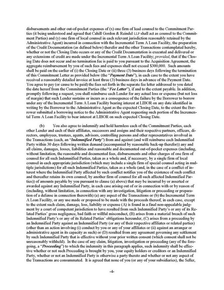 disbursements and other out-of-pocket expenses of (x) one firm of lead counsel to the Commitment Par- ties (it being understood and agreed that Cahill Gordon & Reindel LLP shall act as counsel to the Commit- ment Parties) and (y) one firm of local counsel in each relevant jurisdiction reasonably retained by the Administrative Agent) incurred in connection with the Incremental Term A Loan Facility, the preparation of the Credit Documentation (as defined below) therefor and the other Transactions contemplated hereby, whether or not the Closing Date occurs or any of the Credit Documentation is executed and delivered or any extensions of credit are made under the Incremental Term A Loan Facility; provided, that if the Clos- ing Date does not occur and no termination fee is paid to you pursuant to the Acquisition Agreement, the aggregate reimbursement by you of such fees and expenses shall not exceed $300,000. Such amounts shall be paid on the earlier of (i) the Closing Date or (ii) three (3) business days following the termination of this Commitment Letter as provided below (the “Payment Date”), in each case to the extent you have received a reasonably detailed invoice at least three (3) business days in advance of the Payment Date. You agree to pay (or cause to be paid) the fees set forth in the separate fee letter addressed to you dated the date hereof from the Commitment Parties (the “Fee Letter”), if and to the extent payable. In addition, promptly following a request, you shall reimburse each Lender for any actual loss or expense (but not loss of margin) that such Lender sustains or incurs as a consequence of the failure by the Borrower to borrow under any of the Incremental Term A Loan Facility bearing interest at LIBOR on any date identified in writing by the Borrower to the Administrative Agent as the expected Closing Date, to the extent the Bor- rower submitted a borrowing notice to the Administrative Agent requesting such portion of the Incremen- tal Term A Loan Facility to bear interest at LIBOR on such expected Closing Date.(b) You also agree to indemnify and hold harmless each of the Commitment Parties, each other Lender and each of their affiliates, successors and assigns and their respective partners, officers, di- rectors, employees, trustees, agents, advisors, controlling persons and other representatives involved in the Transactions (each, an “Indemnified Party”) from and against (and will reimburse each Indemnified Party within 30 days following written demand (accompanied by reasonable back-up therefor)) any and all claims, damages, losses, liabilities and reasonable and documented out-of-pocket expenses (including, without limitation, the reasonable and documented fees, disbursements and other charges of one firm of counsel for all such Indemnified Parties, taken as a whole and, if necessary, by a single firm of local counsel in each appropriate jurisdiction (which may include a single firm of special counsel acting in mul- tiple jurisdictions) for all such Indemnified Parties, taken as a whole (and, in the case of a conflict of in- terest where the Indemnified Party affected by such conflict notifies you of the existence of such conflict and thereafter retains its own counsel, by another firm of counsel for all such affected Indemnified Par- ties)) of amounts payable by you pursuant to clause (a) above) that may be incurred by or asserted or awarded against any Indemnified Party, in each case arising out of or in connection with or by reason of (including, without limitation, in connection with any investigation, litigation or proceeding or prepara- tion of a defense in connection therewith) (a) any aspect of the Transactions or (b) the Incremental Term A Loan Facility, or any use made or proposed to be made with the proceeds thereof, in each case, except to the extent such claim, damage, loss, liability or expense (A) is found in a final non-appealable judg- ment by a court of competent jurisdiction to have resulted from such Indemnified Party’s or any of its Re- lated Parties’ gross negligence, bad faith or willful misconduct, (B) arises from a material breach of such Indemnified Party’s or any of its Related Parties’ obligations hereunder, (C) arises from a proceeding by an Indemnified Party against an Indemnified Party (or any of their respective affiliates or related parties) (other than an action involving (i) conduct by you or any of your affiliates or (ii) against an arranger or administrative agent in its capacity as such) or (D) resulted from any agreement governing any settlement by such Indemnified Party that is effective without your prior written consent (which consent shall not be unreasonably withheld). In the case of any claim, litigation, investigation or proceeding (any of the fore- going, a “Proceeding”) to which the indemnity in this paragraph applies, such indemnity shall be effec- tive whether or not such Proceeding is brought by you, your equity holders or creditors or an Indemnified Party, whether or not an Indemnified Party is otherwise a party thereto and whether or not any aspect of the Transactions are consummated. It is agreed that none of you (or any of your subsidiaries), the Seller,