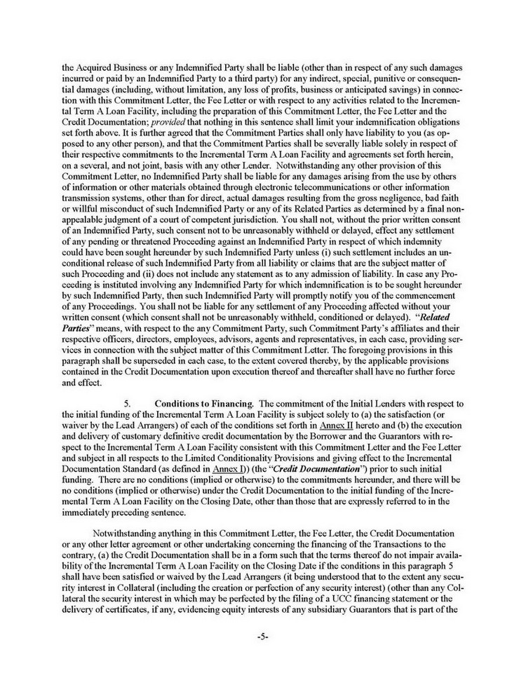 the Acquired Business or any Indemnified Party shall be liable (other than in respect of any such damages incurred or paid by an Indemnified Party to a third party) for any indirect, special, punitive or consequen- tial damages (including, without limitation, any loss of profits, business or anticipated savings) in connec- tion with this Commitment Letter, the Fee Letter or with respect to any activities related to the Incremen- tal Term A Loan Facility, including the preparation of this Commitment Letter, the Fee Letter and the Credit Documentation; provided that nothing in this sentence shall limit your indemnification obligations set forth above. It is further agreed that the Commitment Parties shall only have liability to you (as op- posed to any other person), and that the Commitment Parties shall be severally liable solely in respect of their respective commitments to the Incremental Term A Loan Facility and agreements set forth herein, on a several, and not joint, basis with any other Lender. Notwithstanding any other provision of this Commitment Letter, no Indemnified Party shall be liable for any damages arising from the use by others of information or other materials obtained through electronic telecommunications or other information transmission systems, other than for direct, actual damages resulting from the gross negligence, bad faith or willful misconduct of such Indemnified Party or any of its Related Parties as determined by a final non- appealable judgment of a court of competent jurisdiction. You shall not, without the prior written consent of an Indemnified Party, such consent not to be unreasonably withheld or delayed, effect any settlement of any pending or threatened Proceeding against an Indemnified Party in respect of which indemnity could have been sought hereunder by such Indemnified Party unless (i) such settlement includes an un- conditional release of such Indemnified Party from all liability or claims that are the subject matter of such Proceeding and (ii) does not include any statement as to any admission of liability. In case any Pro- ceeding is instituted involving any Indemnified Party for which indemnification is to be sought hereunder by such Indemnified Party, then such Indemnified Party will promptly notify you of the commencement of any Proceedings. You shall not be liable for any settlement of any Proceeding affected without your written consent (which consent shall not be unreasonably withheld, conditioned or delayed). “Related Parties” means, with respect to the any Commitment Party, such Commitment Party’s affiliates and their respective officers, directors, employees, advisors, agents and representatives, in each case, providing ser- vices in connection with the subject matter of this Commitment Letter. The foregoing provisions in this paragraph shall be superseded in each case, to the extent covered thereby, by the applicable provisions contained in the Credit Documentation upon execution thereof and thereafter shall have no further force and effect.5. Conditions to Financing. The commitment of the Initial Lenders with respect to the initial funding of the Incremental Term A Loan Facility is subject solely to (a) the satisfaction (or waiver by the Lead Arrangers) of each of the conditions set forth in Annex II hereto and (b) the execution and delivery of customary definitive credit documentation by the Borrower and the Guarantors with re- spect to the Incremental Term A Loan Facility consistent with this Commitment Letter and the Fee Letter and subject in all respects to the Limited Conditionality Provisions and giving effect to the Incremental Documentation Standard (as defined in Annex I)) (the “Credit Documentation”) prior to such initial funding. There are no conditions (implied or otherwise) to the commitments hereunder, and there will be no conditions (implied or otherwise) under the Credit Documentation to the initial funding of the Incre- mental Term A Loan Facility on the Closing Date, other than those that are expressly referred to in the immediately preceding sentence.Notwithstanding anything in this Commitment Letter, the Fee Letter, the Credit Documentation or any other letter agreement or other undertaking concerning the financing of the Transactions to the contrary, (a) the Credit Documentation shall be in a form such that the terms thereof do not impair availa- bility of the Incremental Term A Loan Facility on the Closing Date if the conditions in this paragraph 5 shall have been satisfied or waived by the Lead Arrangers (it being understood that to the extent any secu- rity interest in Collateral (including the creation or perfection of any security interest) (other than any Col- lateral the security interest in which may be perfected by the filing of a UCC financing statement or the delivery of certificates, if any, evidencing equity interests of any subsidiary Guarantors that is part of the