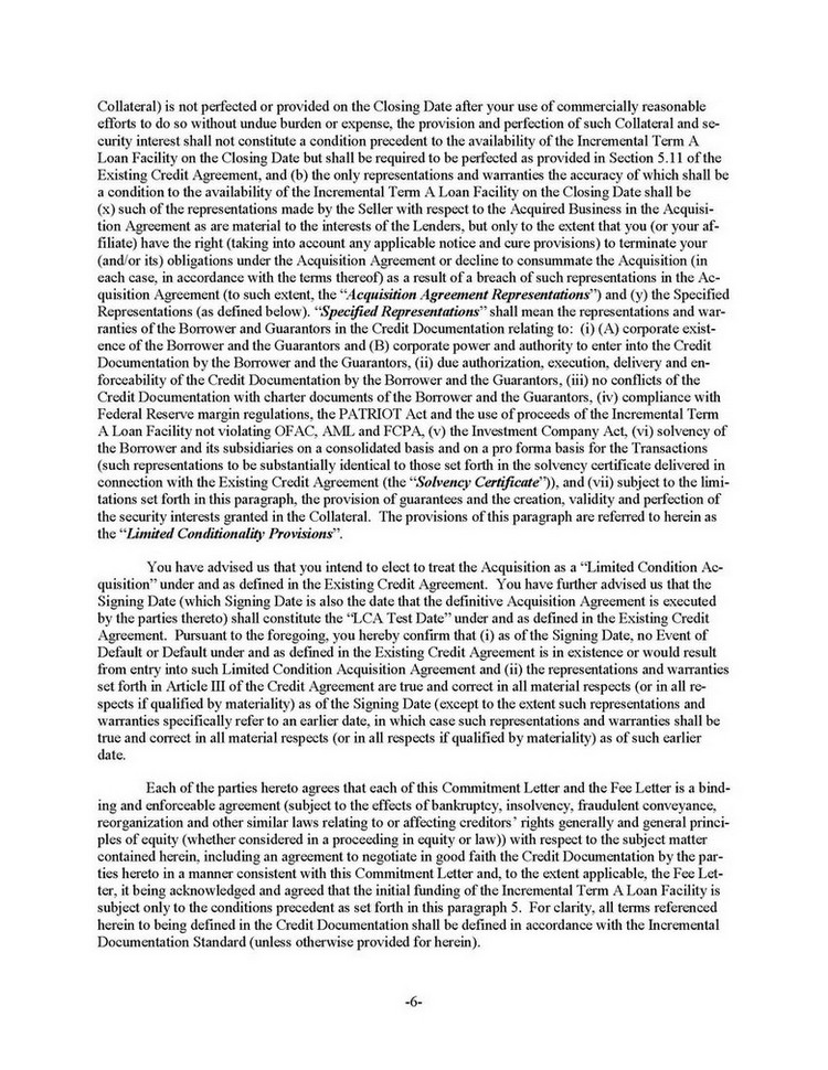 Collateral) is not perfected or provided on the Closing Date after your use of commercially reasonable efforts to do so without undue burden or expense, the provision and perfection of such Collateral and se- curity interest shall not constitute a condition precedent to the availability of the Incremental Term A Loan Facility on the Closing Date but shall be required to be perfected as provided in Section 5.11 of the Existing Credit Agreement, and (b) the only representations and warranties the accuracy of which shall be a condition to the availability of the Incremental Term A Loan Facility on the Closing Date shall be (x) such of the representations made by the Seller with respect to the Acquired Business in the Acquisi- tion Agreement as are material to the interests of the Lenders, but only to the extent that you (or your af- filiate) have the right (taking into account any applicable notice and cure provisions) to terminate your (and/or its) obligations under the Acquisition Agreement or decline to consummate the Acquisition (in each case, in accordance with the terms thereof) as a result of a breach of such representations in the Ac- quisition Agreement (to such extent, the “Acquisition Agreement Representations”) and (y) the Specified Representations (as defined below). “Specified Representations” shall mean the representations and war- ranties of the Borrower and Guarantors in the Credit Documentation relating to: (i) (A) corporate exist- ence of the Borrower and the Guarantors and (B) corporate power and authority to enter into the Credit Documentation by the Borrower and the Guarantors, (ii) due authorization, execution, delivery and en- forceability of the Credit Documentation by the Borrower and the Guarantors, (iii) no conflicts of the Credit Documentation with charter documents of the Borrower and the Guarantors, (iv) compliance with Federal Reserve margin regulations, the PATRIOT Act and the use of proceeds of the Incremental Term A Loan Facility not violating OFAC, AML and FCPA, (v) the Investment Company Act, (vi) solvency of the Borrower and its subsidiaries on a consolidated basis and on a pro forma basis for the Transactions (such representations to be substantially identical to those set forth in the solvency certificate delivered in connection with the Existing Credit Agreement (the “Solvency Certificate”)), and (vii) subject to the limi- tations set forth in this paragraph, the provision of guarantees and the creation, validity and perfection of the security interests granted in the Collateral. The provisions of this paragraph are referred to herein as the “Limited Conditionality Provisions”.You have advised us that you intend to elect to treat the Acquisition as a “Limited Condition Ac- quisition” under and as defined in the Existing Credit Agreement. You have further advised us that the Signing Date (which Signing Date is also the date that the definitive Acquisition Agreement is executed by the parties thereto) shall constitute the “LCA Test Date” under and as defined in the Existing Credit Agreement. Pursuant to the foregoing, you hereby confirm that (i) as of the Signing Date, no Event of Default or Default under and as defined in the Existing Credit Agreement is in existence or would result from entry into such Limited Condition Acquisition Agreement and (ii) the representations and warranties set forth in Article III of the Credit Agreement are true and correct in all material respects (or in all re- spects if qualified by materiality) as of the Signing Date (except to the extent such representations and warranties specifically refer to an earlier date, in which case such representations and warranties shall be true and correct in all material respects (or in all respects if qualified by materiality) as of such earlier date.Each of the parties hereto agrees that each of this Commitment Letter and the Fee Letter is a bind- ing and enforceable agreement (subject to the effects of bankruptcy, insolvency, fraudulent conveyance, reorganization and other similar laws relating to or affecting creditors’ rights generally and general princi- ples of equity (whether considered in a proceeding in equity or law)) with respect to the subject matter contained herein, including an agreement to negotiate in good faith the Credit Documentation by the par- ties hereto in a manner consistent with this Commitment Letter and, to the extent applicable, the Fee Let- ter, it being acknowledged and agreed that the initial funding of the Incremental Term A Loan Facility is subject only to the conditions precedent as set forth in this paragraph 5. For clarity, all terms referenced herein to being defined in the Credit Documentation shall be defined in accordance with the Incremental Documentation Standard (unless otherwise provided for herein).