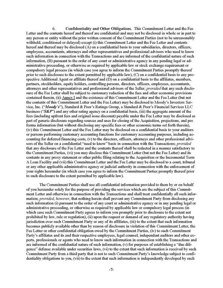 6. Confidentiality and Other Obligations. This Commitment Letter and the Fee Letter and the contents hereof and thereof are confidential and may not be disclosed in whole or in part to any person or entity without the prior written consent of the Commitment Parties (not to be unreasonably withheld, conditioned or delayed) except (i) this Commitment Letter and the Fee Letter and contents hereof and thereof may be disclosed (A) on a confidential basis to your subsidiaries, directors, officers, employees, accountants, attorneys and other representatives and professional advisors who need to know such information in connection with the Transactions and are informed of the confidential nature of such information, (B) pursuant to the order of any court or administrative agency in any pending legal or ad- ministrative proceeding, or otherwise as required by applicable law or stock exchange requirement or compulsory legal process (in which case you agree to inform the Commitment Parties promptly thereof prior to such disclosure to the extent permitted by applicable law), (C) on a confidential basis to any pro- spective Additional Agent or affiliate thereof and (D) on a confidential basis to the affiliates, members, partners, stockholders, equity holders, controlling persons, directors, officers, employees, accountants, attorneys and other representatives and professional advisors of the Seller; provided that any such disclo- sure of the Fee Letter shall be subject to customary redaction of the fees and other economic provisions contained therein, (ii) Annex I and the existence of this Commitment Letter and the Fee Letter (but not the contents of this Commitment Letter and the Fee Letter) may be disclosed to Moody’s Investors Ser- vice, Inc. (“Moody’s”), Standard & Poor’s Ratings Group, a Standard & Poor’s Financial Services LLC business (“S&P”) and any other rating agency on a confidential basis, (iii) the aggregate amount of the fees (including upfront fees and original issue discount) payable under the Fee Letter may be disclosed as part of generic disclosure regarding sources and uses for closing of the Acquisition, projections, and pro forma information (but without disclosing any specific fees or other economic terms set forth therein), (iv) this Commitment Letter and the Fee Letter may be disclosed on a confidential basis to your auditors or persons performing customary accounting functions for customary accounting purposes, including ac- counting for deferred financing costs, (v) to the directors, officers, attorneys and other professional advi- sors of the Seller on a confidential “need to know” basis in connection with the Transactions; provided that any disclosure of the Fee Letter and the contents thereof shall be redacted in a manner satisfactory to the Commitment Parties, (vi) you may disclose this Commitment Letter (but not the Fee Letter) and its contents in any proxy statement or other public filing relating to the Acquisition or the Incremental Term A Loan Facility and (vii) this Commitment Letter and the Fee Letter may be disclosed to a court, tribunal or any other applicable administrative agency or judicial authority in connection with the enforcement of your rights hereunder (in which case you agree to inform the Commitment Parties promptly thereof prior to such disclosure to the extent permitted by applicable law).The Commitment Parties shall use all confidential information provided to them by or on behalf of you hereunder solely for the purpose of providing the services which are the subject of this Commit- ment Letter and otherwise in connection with the Transactions and shall treat confidentially all such infor- mation; provided, however, that nothing herein shall prevent any Commitment Party from disclosing any such information (i) pursuant to the order of any court or administrative agency or in any pending legal or administrative proceeding, or otherwise as required by applicable law or compulsory legal process (in which case such Commitment Party agrees to inform you promptly prior to disclosure to the extent not prohibited by law, rule or regulation), (ii) upon the request or demand of any regulatory authority having jurisdiction over such Commitment Party or any of its affiliates, (iii) to the extent that such information becomes publicly available other than by reason of disclosure in violation of this Commitment Letter, the Fee Letter or other confidential obligation owed by the Commitment Parties, (iv) to such Commitment Party’s affiliates and its and their respective employees, legal counsel, independent auditors and other ex- perts, professionals or agents who need to know such information in connection with the Transactions and are informed of the confidential nature of such information, (v) for purposes of establishing a “due dili- gence” defense available under securities laws, (vi) to the extent that such information is received by such Commitment Party from a third party that is not to such Commitment Party’s knowledge subject to confi- dentiality obligations to you, (vii) to the extent that such information is independently developed by such
