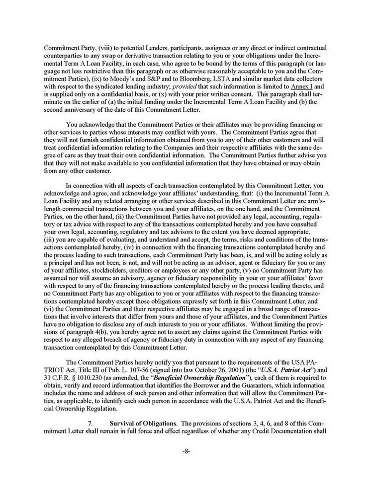 Commitment Party, (viii) to potential Lenders, participants, assignees or any direct or indirect contractual counterparties to any swap or derivative transaction relating to you or your obligations under the Incre- mental Term A Loan Facility, in each case, who agree to be bound by the terms of this paragraph (or lan- guage not less restrictive than this paragraph or as otherwise reasonably acceptable to you and the Com- mitment Parties), (ix) to Moody’s and S&P and to Bloomberg, LSTA and similar market data collectors with respect to the syndicated lending industry; provided that such information is limited to Annex I and is supplied only on a confidential basis, or (x) with your prior written consent. This paragraph shall ter- minate on the earlier of (a) the initial funding under the Incremental Term A Loan Facility and (b) the second anniversary of the date of this Commitment Letter.You acknowledge that the Commitment Parties or their affiliates may be providing financing or other services to parties whose interests may conflict with yours. The Commitment Parties agree that they will not furnish confidential information obtained from you to any of their other customers and will treat confidential information relating to the Companies and their respective affiliates with the same de- gree of care as they treat their own confidential information. The Commitment Parties further advise you that they will not make available to you confidential information that they have obtained or may obtain from any other customer.In connection with all aspects of each transaction contemplated by this Commitment Letter, you acknowledge and agree, and acknowledge your affiliates’ understanding, that: (i) the Incremental Term A Loan Facility and any related arranging or other services described in this Commitment Letter are arm’s- length commercial transactions between you and your affiliates, on the one hand, and the Commitment Parties, on the other hand, (ii) the Commitment Parties have not provided any legal, accounting, regula- tory or tax advice with respect to any of the transactions contemplated hereby and you have consulted your own legal, accounting, regulatory and tax advisors to the extent you have deemed appropriate, (iii) you are capable of evaluating, and understand and accept, the terms, risks and conditions of the trans- actions contemplated hereby, (iv) in connection with the financing transactions contemplated hereby and the process leading to such transactions, each Commitment Party has been, is, and will be acting solely as a principal and has not been, is not, and will not be acting as an advisor, agent or fiduciary for you or any of your affiliates, stockholders, creditors or employees or any other party, (v) no Commitment Party has assumed nor will assume an advisory, agency or fiduciary responsibility in your or your affiliates’ favor with respect to any of the financing transactions contemplated hereby or the process leading thereto, and no Commitment Party has any obligation to you or your affiliates with respect to the financing transac- tions contemplated hereby except those obligations expressly set forth in this Commitment Letter, and (vi) the Commitment Parties and their respective affiliates may be engaged in a broad range of transac- tions that involve interests that differ from yours and those of your affiliates, and the Commitment Parties have no obligation to disclose any of such interests to you or your affiliates. Without limiting the provi- sions of paragraph 4(b), you hereby agree not to assert any claims against the Commitment Parties with respect to any alleged breach of agency or fiduciary duty in connection with any aspect of any financing transaction contemplated by this Commitment Letter.The Commitment Parties hereby notify you that pursuant to the requirements of the USA PA- TRIOT Act, Title III of Pub. L. 107-56 (signed into law October 26, 2001) (the “U.S.A. Patriot Act”) and 31 C.F.R. § 1010.230 (as amended, the “Beneficial Ownership Regulation”), each of them is required to obtain, verify and record information that identifies the Borrower and the Guarantors, which information includes the name and address of such person and other information that will allow the Commitment Par- ties, as applicable, to identify each such person in accordance with the U.S.A. Patriot Act and the Benefi- cial Ownership Regulation.7. Survival of Obligations. The provisions of sections 3, 4, 6, and 8 of this Com- mitment Letter shall remain in full force and effect regardless of whether any Credit Documentation shall