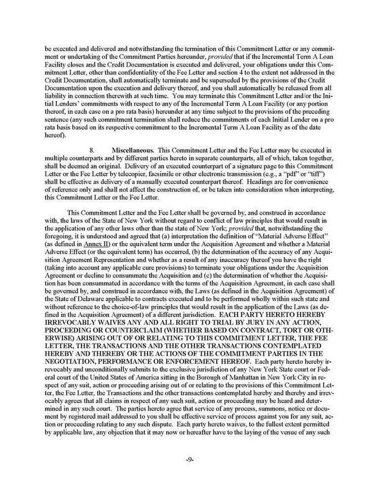 be executed and delivered and notwithstanding the termination of this Commitment Letter or any commit- ment or undertaking of the Commitment Parties hereunder, provided that if the Incremental Term A Loan Facility closes and the Credit Documentation is executed and delivered, your obligations under this Com- mitment Letter, other than confidentiality of the Fee Letter and section 4 to the extent not addressed in the Credit Documentation, shall automatically terminate and be superseded by the provisions of the Credit Documentation upon the execution and delivery thereof, and you shall automatically be released from all liability in connection therewith at such time. You may terminate this Commitment Letter and/or the Ini- tial Lenders’ commitments with respect to any of the Incremental Term A Loan Facility (or any portion thereof, in each case on a pro rata basis) hereunder at any time subject to the provisions of the preceding sentence (any such commitment termination shall reduce the commitments of each Initial Lender on a pro rata basis based on its respective commitment to the Incremental Term A Loan Facility as of the date hereof).8. Miscellaneous. This Commitment Letter and the Fee Letter may be executed in multiple counterparts and by different parties hereto in separate counterparts, all of which, taken together, shall be deemed an original. Delivery of an executed counterpart of a signature page to this Commitment Letter or the Fee Letter by telecopier, facsimile or other electronic transmission (e.g., a “pdf” or “tiff”) shall be effective as delivery of a manually executed counterpart thereof. Headings are for convenience of reference only and shall not affect the construction of, or be taken into consideration when interpreting, this Commitment Letter or the Fee Letter.This Commitment Letter and the Fee Letter shall be governed by, and construed in accordance with, the laws of the State of New York without regard to conflict of law principles that would result in the application of any other laws other than the state of New York; provided that, notwithstanding the foregoing, it is understood and agreed that (a) interpretation the definition of “Material Adverse Effect” (as defined in Annex II) or the equivalent term under the Acquisition Agreement and whether a Material Adverse Effect (or the equivalent term) has occurred, (b) the determination of the accuracy of any Acqui- sition Agreement Representation and whether as a result of any inaccuracy thereof you have the right (taking into account any applicable cure provisions) to terminate your obligations under the Acquisition Agreement or decline to consummate the Acquisition and (c) the determination of whether the Acquisi- tion has been consummated in accordance with the terms of the Acquisition Agreement, in each case shall be governed by, and construed in accordance with, the Laws (as defined in the Acquisition Agreement) of the State of Delaware applicable to contracts executed and to be performed wholly within such state and without reference to the choice-of-law principles that would result in the application of the Laws (as de- fined in the Acquisition Agreement) of a different jurisdiction. EACH PARTY HERETO HEREBY IRREVOCABLY WAIVES ANY AND ALL RIGHT TO TRIAL BY JURY IN ANY ACTION, PROCEEDING OR COUNTERCLAIM (WHETHER BASED ON CONTRACT, TORT OR OTH- ERWISE) ARISING OUT OF OR RELATING TO THIS COMMITMENT LETTER, THE FEE LETTER, THE TRANSACTIONS AND THE OTHER TRANSACTIONS CONTEMPLATED HEREBY AND THEREBY OR THE ACTIONS OF THE COMMITMENT PARTIES IN THE NEGOTIATION, PERFORMANCE OR ENFORCEMENT HEREOF. Each party hereto hereby ir- revocably and unconditionally submits to the exclusive jurisdiction of any New York State court or Fed- eral court of the United States of America sitting in the Borough of Manhattan in New York City in re- spect of any suit, action or proceeding arising out of or relating to the provisions of this Commitment Let- ter, the Fee Letter, the Transactions and the other transactions contemplated hereby and thereby and irrev- ocably agrees that all claims in respect of any such suit, action or proceeding may be heard and deter- mined in any such court. The parties hereto agree that service of any process, summons, notice or docu- ment by registered mail addressed to you shall be effective service of process against you for any suit, ac- tion or proceeding relating to any such dispute. Each party hereto waives, to the fullest extent permitted by applicable law, any objection that it may now or hereafter have to the laying of the venue of any such
