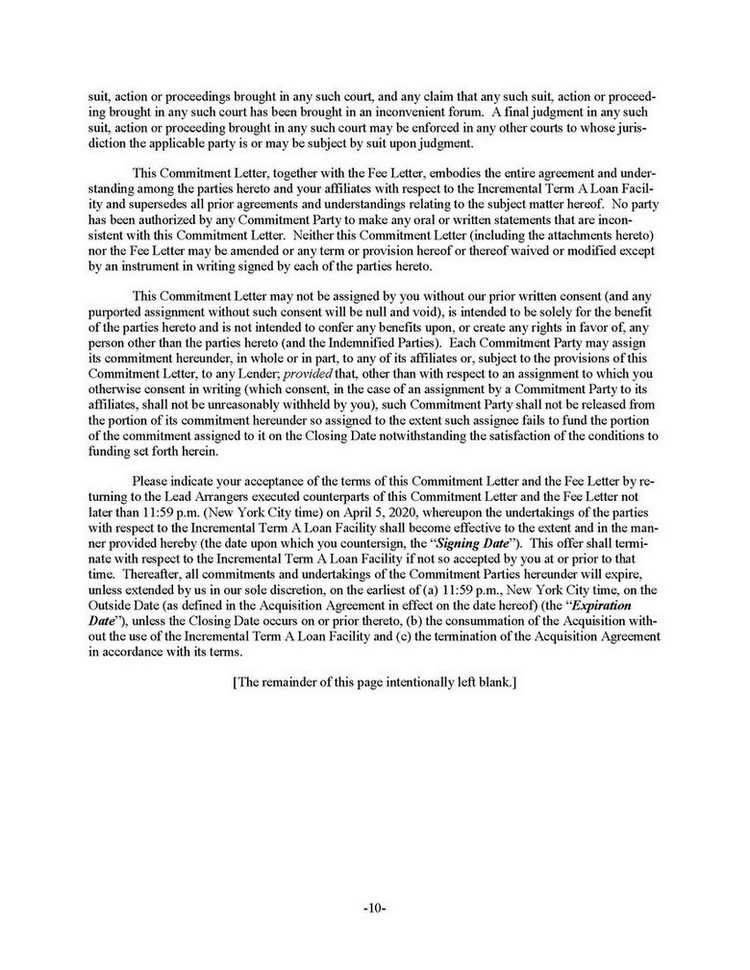 suit, action or proceedings brought in any such court, and any claim that any such suit, action or proceed- ing brought in any such court has been brought in an inconvenient forum. A final judgment in any such suit, action or proceeding brought in any such court may be enforced in any other courts to whose juris- diction the applicable party is or may be subject by suit upon judgment.This Commitment Letter, together with the Fee Letter, embodies the entire agreement and under- standing among the parties hereto and your affiliates with respect to the Incremental Term A Loan Facil- ity and supersedes all prior agreements and understandings relating to the subject matter hereof. No party has been authorized by any Commitment Party to make any oral or written statements that are incon- sistent with this Commitment Letter. Neither this Commitment Letter (including the attachments hereto) nor the Fee Letter may be amended or any term or provision hereof or thereof waived or modified except by an instrument in writing signed by each of the parties hereto.This Commitment Letter may not be assigned by you without our prior written consent (and any purported assignment without such consent will be null and void), is intended to be solely for the benefit of the parties hereto and is not intended to confer any benefits upon, or create any rights in favor of, any person other than the parties hereto (and the Indemnified Parties). Each Commitment Party may assign its commitment hereunder, in whole or in part, to any of its affiliates or, subject to the provisions of this Commitment Letter, to any Lender; provided that, other than with respect to an assignment to which you otherwise consent in writing (which consent, in the case of an assignment by a Commitment Party to its affiliates, shall not be unreasonably withheld by you), such Commitment Party shall not be released from the portion of its commitment hereunder so assigned to the extent such assignee fails to fund the portion of the commitment assigned to it on the Closing Date notwithstanding the satisfaction of the conditions to funding set forth herein.Please indicate your acceptance of the terms of this Commitment Letter and the Fee Letter by re- turning to the Lead Arrangers executed counterparts of this Commitment Letter and the Fee Letter not later than 11:59 p.m. (New York City time) on April 5, 2020, whereupon the undertakings of the parties with respect to the Incremental Term A Loan Facility shall become effective to the extent and in the man- ner provided hereby (the date upon which you countersign, the “Signing Date”). This offer shall termi- nate with respect to the Incremental Term A Loan Facility if not so accepted by you at or prior to that time. Thereafter, all commitments and undertakings of the Commitment Parties hereunder will expire, unless extended by us in our sole discretion, on the earliest of (a) 11:59 p.m., New York City time, on the Outside Date (as defined in the Acquisition Agreement in effect on the date hereof) (the “Expiration Date”), unless the Closing Date occurs on or prior thereto, (b) the consummation of the Acquisition with- out the use of the Incremental Term A Loan Facility and (c) the termination of the Acquisition Agreement in accordance with its terms.[The remainder of this page intentionally left blank.]