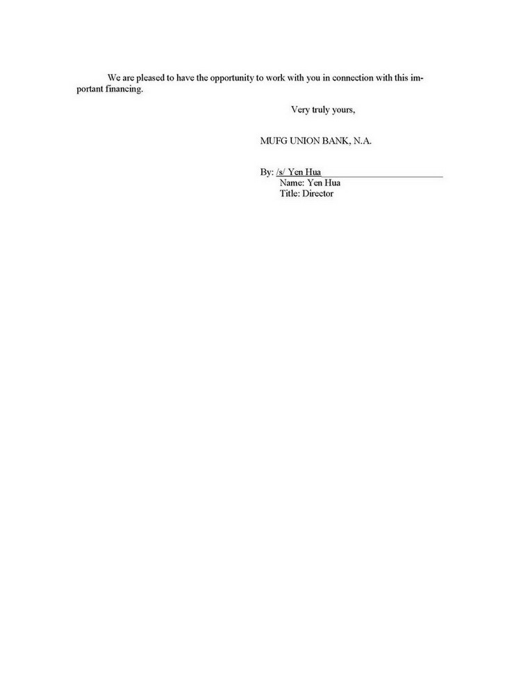 We are pleased to have the opportunity to work with you in connection with this im- portant financing.Very truly yours, MUFG UNION BANK, N.A. By: /s/ Yen Hua Name: Yen Hua Title: Director