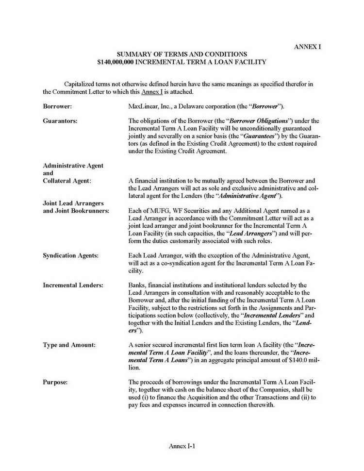 SUMMARY OF TERMS AND CONDITIONS $140,000,000 INCREMENTAL TERM A LOAN FACILITYANNEX ICapitalized terms not otherwise defined herein have the same meanings as specified therefor in the Commitment Letter to which this Annex I is attached.Borrower: MaxLinear, Inc., a Delaware corporation (the “Borrower”).Guarantors: The obligations of the Borrower (the “Borrower Obligations”) under the Incremental Term A Loan Facility will be unconditionally guaranteed jointly and severally on a senior basis (the “Guarantees”) by the Guaran- tors (as defined in the Existing Credit Agreement) to the extent required under the Existing Credit Agreement.Administrative Agent and Collateral Agent: A financial institution to be mutually agreed between the Borrower and the Lead Arrangers will act as sole and exclusive administrative and col- lateral agent for the Lenders (the “Administrative Agent”).Joint Lead Arrangers and Joint Bookrunners: Each of MUFG, WF Securities and any Additional Agent named as a Lead Arranger in accordance with the Commitment Letter will act as a joint lead arranger and joint bookrunner for the Incremental Term A Loan Facility (in such capacities, the “Lead Arrangers”) and will per- form the duties customarily associated with such roles.Syndication Agents: Each Lead Arranger, with the exception of the Administrative Agent, will act as a co-syndication agent for the Incremental Term A Loan Fa- cility.Incremental Lenders: Banks, financial institutions and institutional lenders selected by the Lead Arrangers in consultation with and reasonably acceptable to the Borrower and, after the initial funding of the Incremental Term A Loan Facility, subject to the restrictions set forth in the Assignments and Par- ticipations section below (collectively, the “Incremental Lenders” and together with the Initial Lenders and the Existing Lenders, the “Lend- ers”).Type and Amount: A senior secured incremental first lien term loan A facility (the “Incre- mental Term A Loan Facility”, and the loans thereunder, the “Incre- mental Term A Loans”) in an aggregate principal amount of $140.0 mil- lion.Purpose: The proceeds of borrowings under the Incremental Term A Loan Facil- ity, together with cash on the balance sheet of the Companies, shall be used (i) to finance the Acquisition and the other Transactions and (ii) to pay fees and expenses incurred in connection therewith.