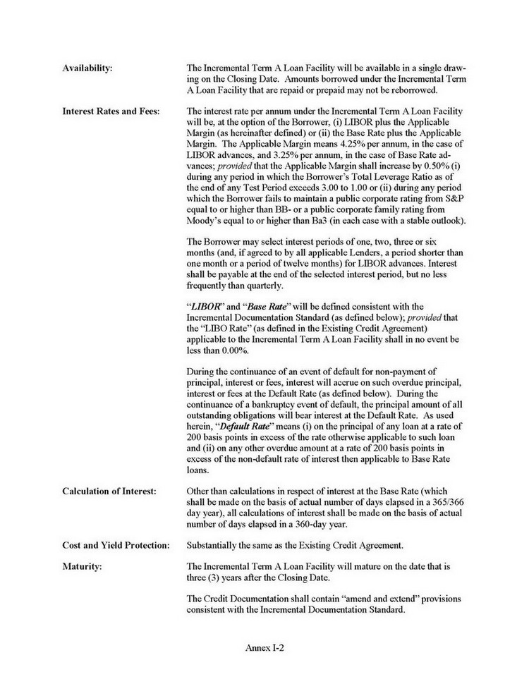 Availability: The Incremental Term A Loan Facility will be available in a single draw- ing on the Closing Date. Amounts borrowed under the Incremental Term A Loan Facility that are repaid or prepaid may not be reborrowed.Interest Rates and Fees: The interest rate per annum under the Incremental Term A Loan Facility will be, at the option of the Borrower, (i) LIBOR plus the Applicable Margin (as hereinafter defined) or (ii) the Base Rate plus the Applicable Margin. The Applicable Margin means 4.25% per annum, in the case of LIBOR advances, and 3.25% per annum, in the case of Base Rate ad- vances; provided that the Applicable Margin shall increase by 0.50% (i) during any period in which the Borrower’s Total Leverage Ratio as of the end of any Test Period exceeds 3.00 to 1.00 or (ii) during any period which the Borrower fails to maintain a public corporate rating from S&P equal to or higher than BB- or a public corporate family rating from Moody’s equal to or higher than Ba3 (in each case with a stable outlook).The Borrower may select interest periods of one, two, three or six months (and, if agreed to by all applicable Lenders, a period shorter than one month or a period of twelve months) for LIBOR advances. Interest shall be payable at the end of the selected interest period, but no less frequently than quarterly.“LIBOR” and “Base Rate” will be defined consistent with the Incremental Documentation Standard (as defined below); provided that the “LIBO Rate” (as defined in the Existing Credit Agreement) applicable to the Incremental Term A Loan Facility shall in no event be less than 0.00%.During the continuance of an event of default for non-payment of principal, interest or fees, interest will accrue on such overdue principal, interest or fees at the Default Rate (as defined below). During the continuance of a bankruptcy event of default, the principal amount of all outstanding obligations will bear interest at the Default Rate. As used herein, “Default Rate” means (i) on the principal of any loan at a rate of 200 basis points in excess of the rate otherwise applicable to such loan and (ii) on any other overdue amount at a rate of 200 basis points in excess of the non-default rate of interest then applicable to Base Rate loans.Calculation of Interest: Other than calculations in respect of interest at the Base Rate (which shall be made on the basis of actual number of days elapsed in a 365/366 day year), all calculations of interest shall be made on the basis of actual number of days elapsed in a 360-day year.Cost and Yield Protection: Substantially the same as the Existing Credit Agreement.Maturity: The Incremental Term A Loan Facility will mature on the date that is three (3) years after the Closing Date.The Credit Documentation shall contain “amend and extend” provisions consistent with the Incremental Documentation Standard.