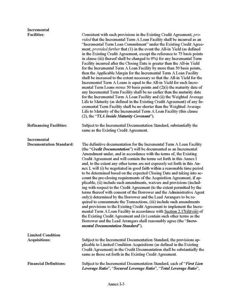 Incremental Facilities: Consistent with such provisions in the Existing Credit Agreement; pro- vided that the Incremental Term A Loan Facility shall be incurred as an “Incremental Term Loan Commitment” under the Existing Credit Agree- ment; provided further that (1) in the event the All-in Yield (as defined in the Existing Credit Agreement, except the reference to 75 basis points in clause (iii) thereof shall be changed to 0%) for any Incremental Term Facility incurred after the Closing Date is greater than the All-in Yield for the Incremental Term A Loan Facility by more than 50 basis points, then the Applicable Margin for the Incremental Term A Loan Facility shall be increased to the extent necessary so that the All-in Yield for the Incremental Term A Loans is equal to the All-in Yield for such Incre- mental Term Loans minus 50 basis points and (2)(i) the maturity date of any Incremental Term Facility shall be no earlier than the maturity date for the Incremental Term A Loan Facility and (ii) the Weighted Average Life to Maturity (as defined in the Existing Credit Agreement) of any In- cremental Term Facility shall be no shorter than the Weighted Average Life to Maturity of the Incremental Term A Loan Facility (this clause (2), the “TLA Inside Maturity Covenant”).Refinancing Facilities: Subject to the Incremental Documentation Standard, substantially the same as the Existing Credit Agreement.Incremental Documentation Standard: The definitive documentation for the Incremental Term A Loan Facility (the “Credit Documentation”) will be documented as an Incremental Amendment under, and in accordance with the terms of, the Existing Credit Agreement and will contain the terms set forth in this Annex I and, to the extent any other terms are not expressly set forth in this An- nex I, will (i) be negotiated in good faith within a reasonable time period to be determined based on the expected Closing Date and taking into ac- count the pre-closing requirements of the Acquisition Agreement, if ap- plicable, (ii) include such amendments, waivers and provisions (includ- ing with respect to the Credit Agreement (to the extent permitted by the terms thereof with consent of the Borrower and the Administrative Agent only)) determined by the Borrower and the Lead Arrangers to be re- quired to consummate the Transactions, (iii) include such amendments and provisions to the Existing Credit Agreement to implement the Incre- mental Term A Loan Facility in accordance with Section 2.17(d)(viii) of the Existing Credit Agreement and (iv) contain such other terms as the Borrower and the Lead Arrangers shall reasonably agree (the “Incre- mental Documentation Standard”).Limited Condition Acquisitions: Subject to the Incremental Documentation Standard, the provisions ap- plicable to Limited Condition Acquisitions (as defined in the Existing Credit Agreement) in the Credit Documentation shall be substantially the same as those set forth in the Existing Credit Agreement.Financial Definitions: Subject to the Incremental Documentation Standard, each of “First Lien Leverage Ratio”, “Secured Leverage Ratio”, “Total Leverage Ratio”,