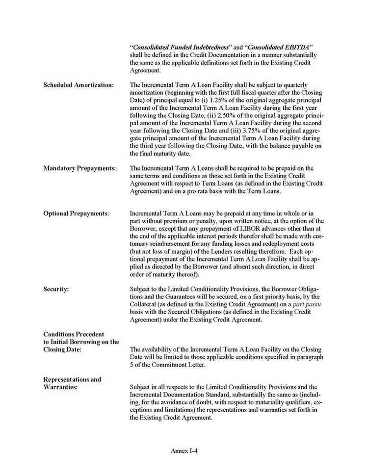 “Consolidated Funded Indebtedness” and “Consolidated EBITDA” shall be defined in the Credit Documentation in a manner substantially the same as the applicable definitions set forth in the Existing Credit Agreement.Scheduled Amortization: The Incremental Term A Loan Facility shall be subject to quarterly amortization (beginning with the first full fiscal quarter after the Closing Date) of principal equal to (i) 1.25% of the original aggregate principal amount of the Incremental Term A Loan Facility during the first year following the Closing Date, (ii) 2.50% of the original aggregate princi- pal amount of the Incremental Term A Loan Facility during the second year following the Closing Date and (iii) 3.75% of the original aggre- gate principal amount of the Incremental Term A Loan Facility during the third year following the Closing Date, with the balance payable on the final maturity date.Mandatory Prepayments: The Incremental Term A Loans shall be required to be prepaid on the same terms and conditions as those set forth in the Existing Credit Agreement with respect to Term Loans (as defined in the Existing Credit Agreement) and on a pro rata basis with the Term Loans.Optional Prepayments: Incremental Term A Loans may be prepaid at any time in whole or in part without premium or penalty, upon written notice, at the option of the Borrower, except that any prepayment of LIBOR advances other than at the end of the applicable interest periods therefor shall be made with cus- tomary reimbursement for any funding losses and redeployment costs (but not loss of margin) of the Lenders resulting therefrom. Each op- tional prepayment of the Incremental Term A Loan Facility shall be ap- plied as directed by the Borrower (and absent such direction, in direct order of maturity thereof).Security: Subject to the Limited Conditionality Provisions, the Borrower Obliga- tions and the Guarantees will be secured, on a first priority basis, by the Collateral (as defined in the Existing Credit Agreement) on a pari passu basis with the Secured Obligations (as defined in the Existing Credit Agreement) under the Existing Credit Agreement.Conditions Precedent to Initial Borrowing on the Closing Date: The availability of the Incremental Term A Loan Facility on the Closing Date will be limited to those applicable conditions specified in paragraph 5 of the Commitment Letter.Representations and Warranties: Subject in all respects to the Limited Conditionality Provisions and the Incremental Documentation Standard, substantially the same as (includ- ing, for the avoidance of doubt, with respect to materiality qualifiers, ex- ceptions and limitations) the representations and warranties set forth in the Existing Credit Agreement.