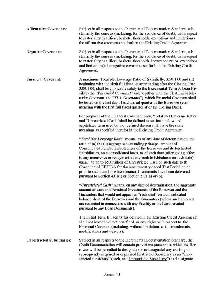Affirmative Covenants: Subject in all respects to the Incremental Documentation Standard, sub- stantially the same as (including, for the avoidance of doubt, with respect to materiality qualifiers, baskets, thresholds, exceptions and limitations) the affirmative covenants set forth in the Existing Credit Agreement.Negative Covenants: Subject in all respects to the Incremental Documentation Standard, sub- stantially the same as (including, for the avoidance of doubt, with respect to materiality qualifiers, baskets, thresholds, incurrence ratios, exceptions and limitations) the negative covenants set forth in the Existing Credit Agreement.Financial Covenant: A maximum Total Net Leverage Ratio of (i) initially, 3.50:1.00 and (ii) beginning with the sixth full fiscal quarter ending after the Closing Date, 3.00:1.00, shall be applicable solely to the Incremental Term A Loan Fa- cility (the “Financial Covenant” and, together with the TLA Inside Ma- turity Covenant, the “TLA Covenants”), which Financial Covenant shall be tested on the last day of each fiscal quarter of the Borrower (com- mencing with the first full fiscal quarter after the Closing Date).For purposes of the Financial Covenant only, “Total Net Leverage Ratio” and “Unrestricted Cash” shall be defined as set forth below. All capitalized term used but not defined therein shall have the same meanings as specified therefor in the Existing Credit Agreement.“Total Net Leverage Ratio” means, as of any date of determination, the ratio of (a) the (x) aggregate outstanding principal amount of Consolidated Funded Indebtedness of the Borrower and its Restricted Subsidiaries, on a consolidated basis, as of such date (after giving effect to any incurrence or repayment of any such Indebtedness on such date) minus (y) up to $50 million of Unrestricted Cash on such date to (b) Consolidated EBITDA for the most recently ended Test Period on or prior to such date for which financial statements have been delivered pursuant to Section 4.01(j) or Section 5.01(a) or (b).“Unrestricted Cash” means, on any date of determination, the aggregate amount of cash and Permitted Investments of the Borrower and the Guarantors that would not appear as “restricted” on a consolidated balance sheet of the Borrower and the Guarantors (unless such amounts are restricted in connection with any Facility or the Liens created pursuant to any Loan Documents).The Initial Term B Facility (as defined in the Existing Credit Agreement) shall not have the direct benefit of, or any rights with respect to, the Financial Covenant (including, without limitation, as to amendments, modifications and waivers).Unrestricted Subsidiaries: Subject in all respects to the Incremental Documentation Standard, the Credit Documentation will contain provisions pursuant to which the Bor- rower will be permitted to designate (or re-designate) any existing or subsequently acquired or organized Restricted Subsidiary as an “unre- stricted subsidiary” (each, an “Unrestricted Subsidiary”) and designate