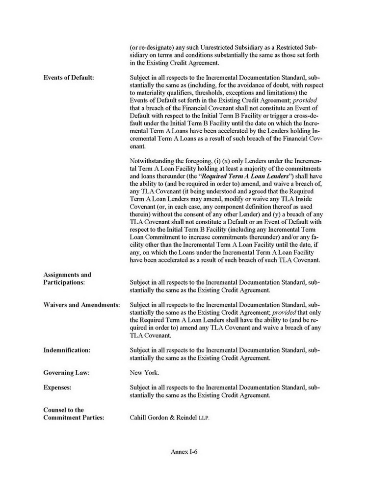 (or re-designate) any such Unrestricted Subsidiary as a Restricted Sub- sidiary on terms and conditions substantially the same as those set forth in the Existing Credit Agreement.Events of Default: Subject in all respects to the Incremental Documentation Standard, sub- stantially the same as (including, for the avoidance of doubt, with respect to materiality qualifiers, thresholds, exceptions and limitations) the Events of Default set forth in the Existing Credit Agreement; provided that a breach of the Financial Covenant shall not constitute an Event of Default with respect to the Initial Term B Facility or trigger a cross-de- fault under the Initial Term B Facility until the date on which the Incre- mental Term A Loans have been accelerated by the Lenders holding In- cremental Term A Loans as a result of such breach of the Financial Cov- enant.Notwithstanding the foregoing, (i) (x) only Lenders under the Incremen- tal Term A Loan Facility holding at least a majority of the commitments and loans thereunder (the “Required Term A Loan Lenders”) shall have the ability to (and be required in order to) amend, and waive a breach of, any TLA Covenant (it being understood and agreed that the Required Term A Loan Lenders may amend, modify or waive any TLA Inside Covenant (or, in each case, any component definition thereof as used therein) without the consent of any other Lender) and (y) a breach of any TLA Covenant shall not constitute a Default or an Event of Default with respect to the Initial Term B Facility (including any Incremental Term Loan Commitment to increase commitments thereunder) and/or any fa- cility other than the Incremental Term A Loan Facility until the date, if any, on which the Loans under the Incremental Term A Loan Facility have been accelerated as a result of such breach of such TLA Covenant.Assignments and Participations: Subject in all respects to the Incremental Documentation Standard, sub- stantially the same as the Existing Credit Agreement.Waivers and Amendments: Subject in all respects to the Incremental Documentation Standard, sub- stantially the same as the Existing Credit Agreement; provided that only the Required Term A Loan Lenders shall have the ability to (and be re- quired in order to) amend any TLA Covenant and waive a breach of any TLA Covenant.Indemnification: Subject in all respects to the Incremental Documentation Standard, sub- stantially the same as the Existing Credit Agreement.Governing Law: New York.Expenses: Subject in all respects to the Incremental Documentation Standard, sub- stantially the same as the Existing Credit Agreement.Counsel to the Commitment Parties: Cahill Gordon & Reindel LLP.
