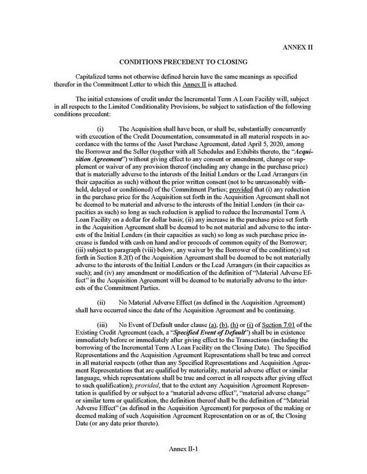 ANNEX IICONDITIONS PRECEDENT TO CLOSINGCapitalized terms not otherwise defined herein have the same meanings as specified therefor in the Commitment Letter to which this Annex II is attached.The initial extensions of credit under the Incremental Term A Loan Facility will, subject in all respects to the Limited Conditionality Provisions, be subject to satisfaction of the following conditions precedent:(i) The Acquisition shall have been, or shall be, substantially concurrently with execution of the Credit Documentation, consummated in all material respects in ac- cordance with the terms of the Asset Purchase Agreement, dated April 5, 2020, among the Borrower and the Seller (together with all Schedules and Exhibits thereto, the “Acqui- sition Agreement”) without giving effect to any consent or amendment, change or sup- plement or waiver of any provision thereof (including any change in the purchase price) that is materially adverse to the interests of the Initial Lenders or the Lead Arrangers (in their capacities as such) without the prior written consent (not to be unreasonably with- held, delayed or conditioned) of the Commitment Parties; provided that (i) any reduction in the purchase price for the Acquisition set forth in the Acquisition Agreement shall not be deemed to be material and adverse to the interests of the Initial Lenders (in their ca- pacities as such) so long as such reduction is applied to reduce the Incremental Term A Loan Facility on a dollar for dollar basis; (ii) any increase in the purchase price set forth in the Acquisition Agreement shall be deemed to be not material and adverse to the inter- ests of the Initial Lenders (in their capacities as such) so long as such purchase price in- crease is funded with cash on hand and/or proceeds of common equity of the Borrower; (iii) subject to paragraph (viii) below, any waiver by the Borrower of the condition(s) set forth in Section 8.2(f) of the Acquisition Agreement shall be deemed to be not materially adverse to the interests of the Initial Lenders or the Lead Arrangers (in their capacities as such); and (iv) any amendment or modification of the definition of “Material Adverse Ef- fect” in the Acquisition Agreement will be deemed to be materially adverse to the inter- ests of the Commitment Parties.(ii) No Material Adverse Effect (as defined in the Acquisition Agreement) shall have occurred since the date of the Acquisition Agreement and be continuing.(iii) No Event of Default under clause (a), (b), (h) or (i) of Section 7.01 of the Existing Credit Agreement (each, a “Specified Event of Default”) shall be in existence immediately before or immediately after giving effect to the Transactions (including the borrowing of the Incremental Term A Loan Facility on the Closing Date). The Specified Representations and the Acquisition Agreement Representations shall be true and correct in all material respects (other than any Specified Representations and Acquisition Agree- ment Representations that are qualified by materiality, material adverse effect or similar language, which representations shall be true and correct in all respects after giving effect to such qualification); provided, that to the extent any Acquisition Agreement Represen- tation is qualified by or subject to a “material adverse effect”, “material adverse change” or similar term or qualification, the definition thereof shall be the definition of “Material Adverse Effect” (as defined in the Acquisition Agreement) for purposes of the making or deemed making of such Acquisition Agreement Representation on or as of, the Closing Date (or any date prior thereto).