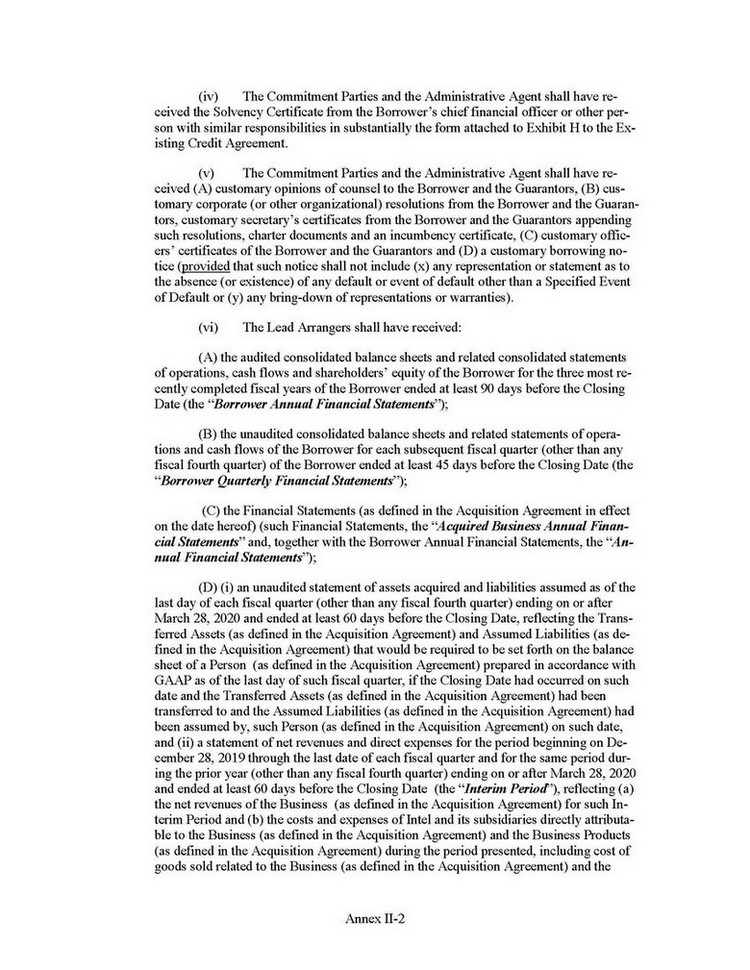 (iv) The Commitment Parties and the Administrative Agent shall have re- ceived the Solvency Certificate from the Borrower’s chief financial officer or other per- son with similar responsibilities in substantially the form attached to Exhibit H to the Ex- isting Credit Agreement.(v) The Commitment Parties and the Administrative Agent shall have re- ceived (A) customary opinions of counsel to the Borrower and the Guarantors, (B) cus- tomary corporate (or other organizational) resolutions from the Borrower and the Guaran- tors, customary secretary’s certificates from the Borrower and the Guarantors appending such resolutions, charter documents and an incumbency certificate, (C) customary offic- ers’ certificates of the Borrower and the Guarantors and (D) a customary borrowing no- tice (provided that such notice shall not include (x) any representation or statement as to the absence (or existence) of any default or event of default other than a Specified Event of Default or (y) any bring-down of representations or warranties).(vi) The Lead Arrangers shall have received:(A) the audited consolidated balance sheets and related consolidated statements of operations, cash flows and shareholders’ equity of the Borrower for the three most re- cently completed fiscal years of the Borrower ended at least 90 days before the Closing Date (the “Borrower Annual Financial Statements”);(B) the unaudited consolidated balance sheets and related statements of opera- tions and cash flows of the Borrower for each subsequent fiscal quarter (other than any fiscal fourth quarter) of the Borrower ended at least 45 days before the Closing Date (the “Borrower Quarterly Financial Statements”);(C) the Financial Statements (as defined in the Acquisition Agreement in effect on the date hereof) (such Financial Statements, the “Acquired Business Annual Finan- cial Statements” and, together with the Borrower Annual Financial Statements, the “An- nual Financial Statements”);(D) (i) an unaudited statement of assets acquired and liabilities assumed as of the last day of each fiscal quarter (other than any fiscal fourth quarter) ending on or after March 28, 2020 and ended at least 60 days before the Closing Date, reflecting the Trans- ferred Assets (as defined in the Acquisition Agreement) and Assumed Liabilities (as de- fined in the Acquisition Agreement) that would be required to be set forth on the balance sheet of a Person (as defined in the Acquisition Agreement) prepared in accordance with GAAP as of the last day of such fiscal quarter, if the Closing Date had occurred on such date and the Transferred Assets (as defined in the Acquisition Agreement) had been transferred to and the Assumed Liabilities (as defined in the Acquisition Agreement) had been assumed by, such Person (as defined in the Acquisition Agreement) on such date, and (ii) a statement of net revenues and direct expenses for the period beginning on De- cember 28, 2019 through the last date of each fiscal quarter and for the same period dur- ing the prior year (other than any fiscal fourth quarter) ending on or after March 28, 2020 and ended at least 60 days before the Closing Date (the “Interim Period”), reflecting (a) the net revenues of the Business (as defined in the Acquisition Agreement) for such In- terim Period and (b) the costs and expenses of Intel and its subsidiaries directly attributa- ble to the Business (as defined in the Acquisition Agreement) and the Business Products (as defined in the Acquisition Agreement) during the period presented, including cost of goods sold related to the Business (as defined in the Acquisition Agreement) and the