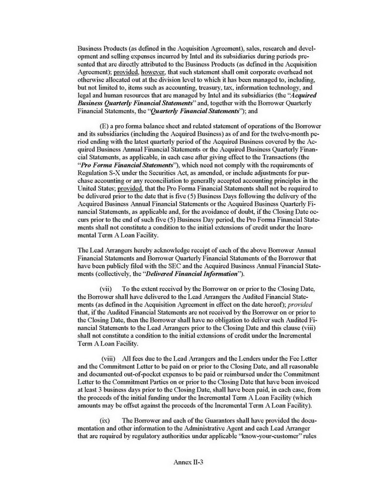 Business Products (as defined in the Acquisition Agreement), sales, research and devel- opment and selling expenses incurred by Intel and its subsidiaries during periods pre- sented that are directly attributed to the Business Products (as defined in the Acquisition Agreement); provided, however, that such statement shall omit corporate overhead not otherwise allocated out at the division level to which it has been managed to, including, but not limited to, items such as accounting, treasury, tax, information technology, and legal and human resources that are managed by Intel and its subsidiaries (the “Acquired Business Quarterly Financial Statements” and, together with the Borrower Quarterly Financial Statements, the “Quarterly Financial Statements”); and(E) a pro forma balance sheet and related statement of operations of the Borrower and its subsidiaries (including the Acquired Business) as of and for the twelve-month pe- riod ending with the latest quarterly period of the Acquired Business covered by the Ac- quired Business Annual Financial Statements or the Acquired Business Quarterly Finan- cial Statements, as applicable, in each case after giving effect to the Transactions (the “Pro Forma Financial Statements”), which need not comply with the requirements of Regulation S-X under the Securities Act, as amended, or include adjustments for pur- chase accounting or any reconciliation to generally accepted accounting principles in the United States; provided, that the Pro Forma Financial Statements shall not be required to be delivered prior to the date that is five (5) Business Days following the delivery of the Acquired Business Annual Financial Statements or the Acquired Business Quarterly Fi- nancial Statements, as applicable and, for the avoidance of doubt, if the Closing Date oc- curs prior to the end of such five (5) Business Day period, the Pro Forma Financial State- ments shall not constitute a condition to the initial extensions of credit under the Incre- mental Term A Loan Facility.The Lead Arrangers hereby acknowledge receipt of each of the above Borrower Annual Financial Statements and Borrower Quarterly Financial Statements of the Borrower that have been publicly filed with the SEC and the Acquired Business Annual Financial State- ments (collectively, the “Delivered Financial Information”).(vii) To the extent received by the Borrower on or prior to the Closing Date, the Borrower shall have delivered to the Lead Arrangers the Audited Financial State- ments (as defined in the Acquisition Agreement in effect on the date hereof); provided that, if the Audited Financial Statements are not received by the Borrower on or prior to the Closing Date, then the Borrower shall have no obligation to deliver such Audited Fi- nancial Statements to the Lead Arrangers prior to the Closing Date and this clause (viii) shall not constitute a condition to the initial extensions of credit under the Incremental Term A Loan Facility.(viii) All fees due to the Lead Arrangers and the Lenders under the Fee Letter and the Commitment Letter to be paid on or prior to the Closing Date, and all reasonable and documented out-of-pocket expenses to be paid or reimbursed under the Commitment Letter to the Commitment Parties on or prior to the Closing Date that have been invoiced at least 3 business days prior to the Closing Date, shall have been paid, in each case, from the proceeds of the initial funding under the Incremental Term A Loan Facility (which amounts may be offset against the proceeds of the Incremental Term A Loan Facility).(ix) The Borrower and each of the Guarantors shall have provided the docu- mentation and other information to the Administrative Agent and each Lead Arranger that are required by regulatory authorities under applicable “know-your-customer” rules