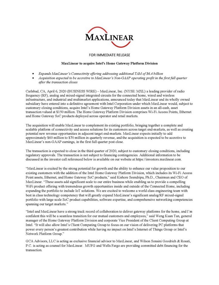 FOR IMMEDIATE RELEASEMaxLinear to acquire Intel’s Home Gateway Platform Division• Expands MaxLinear’s Connectivity offering addressing additional TAM of $6.4 billion • Acquisition expected to be accretive to MaxLinear’s Non-GAAP operating profit in the first full quarter after the transaction closesCarlsbad, CA, April 6, 2020 (BUSINESS WIRE) – MaxLinear, Inc. (NYSE: MXL) a leading provider of radio frequency (RF), analog and mixed-signal integrated circuits for the connected home, wired and wireless infrastructure, and industrial and multimarket applications, announced today that MaxLinear and its wholly owned subsidiary have entered into a definitive agreement with Intel Corporation under which MaxLinear would, subject to customary closing conditions, acquire Intel’s Home Gateway Platform Division assets in an all-cash, asset transaction valued at $150 million. The Home Gateway Platform Division comprises Wi-Fi Access Points, Ethernet and Home Gateway SoC products deployed across operator and retail markets.The acquisition will enable MaxLinear to complement its existing portfolio, bringing together a complete and scalable platform of connectivity and access solutions for its customers across target end-markets, as well as creating potential new revenue opportunities in adjacent target end-markets. MaxLinear expects initially to add approximately $60 million to $70 million in quarterly revenue, and the acquisition is expected to be accretive to MaxLinear’s non-GAAP earnings, in the first full quarter post close.The transaction is expected to close in the third quarter of 2020, subject to customary closing conditions, including regulatory approvals. The transaction is not subject to financing contingencies. Additional information to be discussed in the investor call referenced below is available on our website at https://investors.maxlinear.com.“MaxLinear is excited by the strong potential for growth and the ability to enhance our value proposition to our existing customers with the addition of the Intel Home Gateway Platform Division, which includes its Wi-Fi Access Point assets, Ethernet, and Home Gateway SoC products,” said Kishore Seendripu, Ph.D., Chairman and CEO of MaxLinear. “These assets add significant scale to our entire business while enabling us to provide a compelling WiFi product offering with tremendous growth opportunities inside and outside of the Connected Home, including expanding the portfolio to include IoT solutions. We are excited to welcome a world class engineering team with best in class technology competency that will greatly expand MaxLinear’s significant analog/RF mixed-signal portfolio with large scale SoC product capabilities, software expertise, and comprehensive networking competencies spanning our target markets.”“Intel and MaxLinear have a strong track record of collaboration to deliver gateway platforms for the home, and I’m confident this will be a seamless transition for our mutual customers and employees,” said Weng Kuan Tan, general manager of the Home Gateway Platform Division and corporate Vice President of the Client Computing Group at Intel. “It will also allow Intel’s Client Computing Group to focus on our vision of delivering PC platforms that power every person’s greatest contribution while having no impact on Intel’s Internet of Things Group or Intel’s Network Platform Group.”GCA Advisors, LLC is acting as exclusive financial advisor to MaxLinear, and Wilson Sonsini Goodrich & Rosati, P.C. is acting as counsel for MaxLinear. MUFG and Wells Fargo are providing committed debt financing for the transaction.