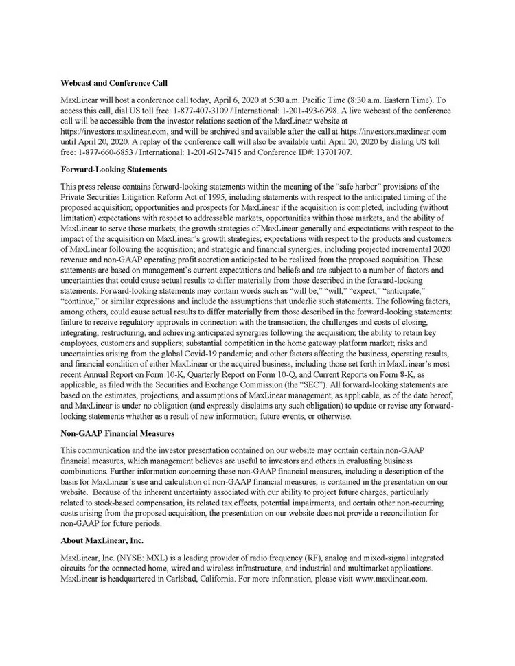 Webcast and Conference CallMaxLinear will host a conference call today, April 6, 2020 at 5:30 a.m. Pacific Time (8:30 a.m. Eastern Time). To access this call, dial US toll free: 1-877-407-3109 / International: 1-201-493-6798. A live webcast of the conference call will be accessible from the investor relations section of the MaxLinear website at https://investors.maxlinear.com, and will be archived and available after the call at https://investors.maxlinear.com until April 20, 2020. A replay of the conference call will also be available until April 20, 2020 by dialing US toll free: 1-877-660-6853 / International: 1-201-612-7415 and Conference ID#: 13701707.Forward-Looking StatementsThis press release contains forward-looking statements within the meaning of the “safe harbor” provisions of the Private Securities Litigation Reform Act of 1995, including statements with respect to the anticipated timing of the proposed acquisition; opportunities and prospects for MaxLinear if the acquisition is completed, including (without limitation) expectations with respect to addressable markets, opportunities within those markets, and the ability of MaxLinear to serve those markets; the growth strategies of MaxLinear generally and expectations with respect to the impact of the acquisition on MaxLinear’s growth strategies; expectations with respect to the products and customers of MaxLinear following the acquisition; and strategic and financial synergies, including projected incremental 2020 revenue and non-GAAP operating profit accretion anticipated to be realized from the proposed acquisition. These statements are based on management’s current expectations and beliefs and are subject to a number of factors and uncertainties that could cause actual results to differ materially from those described in the forward -looking statements. Forward-looking statements may contain words such as “will be,” “will,” “expect,” “anticipate,” “continue,” or similar expressions and include the assumptions that underlie such statements. The following factors, among others, could cause actual results to differ materially from those described in the forward-looking statements: failure to receive regulatory approvals in connection with the transaction; the challenges and costs of closing, integrating, restructuring, and achieving anticipated synergies following the acquisition; the ability to retain key employees, customers and suppliers; substantial competition in the home gateway platform market; risks and uncertainties arising from the global Covid-19 pandemic; and other factors affecting the business, operating results, and financial condition of either MaxLinear or the acquired business, including those set forth in MaxLinear’s most recent Annual Report on Form 10-K, Quarterly Report on Form 10-Q, and Current Reports on Form 8-K, as applicable, as filed with the Securities and Exchange Commission (the “SEC”). All forward-looking statements are based on the estimates, projections, and assumptions of MaxLinear management, as applicable, as of the date hereof, and MaxLinear is under no obligation (and expressly disclaims any such obligation) to update or revise any forward - looking statements whether as a result of new information, future events, or otherwise.Non-GAAP Financial MeasuresThis communication and the investor presentation contained on our website may contain certain non-GAAP financial measures, which management believes are useful to investors and others in evaluating business combinations. Further information concerning these non-GAAP financial measures, including a description of the basis for MaxLinear’s use and calculation of non-GAAP financial measures, is contained in the presentation on our website. Because of the inherent uncertainty associated with our ability to project future charges, particularly related to stock-based compensation, its related tax effects, potential impairments, and certain other non-recurring costs arising from the proposed acquisition, the presentation on our website does not provide a reconciliation for non-GAAP for future periods.About MaxLinear, Inc.MaxLinear, Inc. (NYSE: MXL) is a leading provider of radio frequency (RF), analog and mixed-signal integrated circuits for the connected home, wired and wireless infrastructure, and industrial and multimarket applications. MaxLinear is headquartered in Carlsbad, California. For more information, please visit www.maxlinear.com.