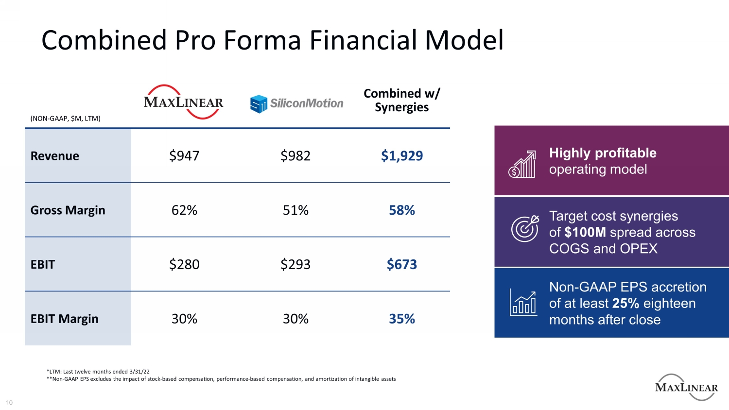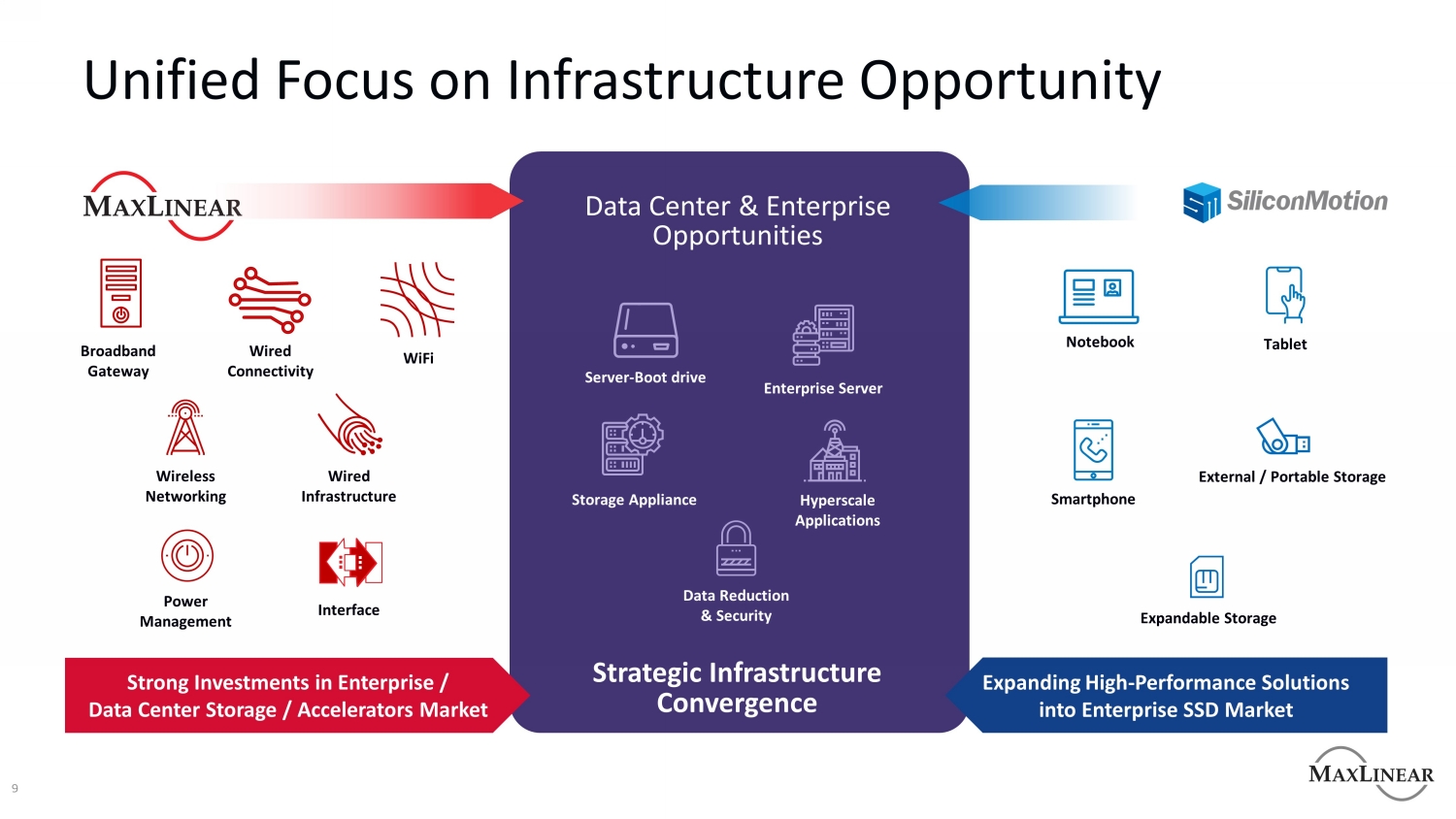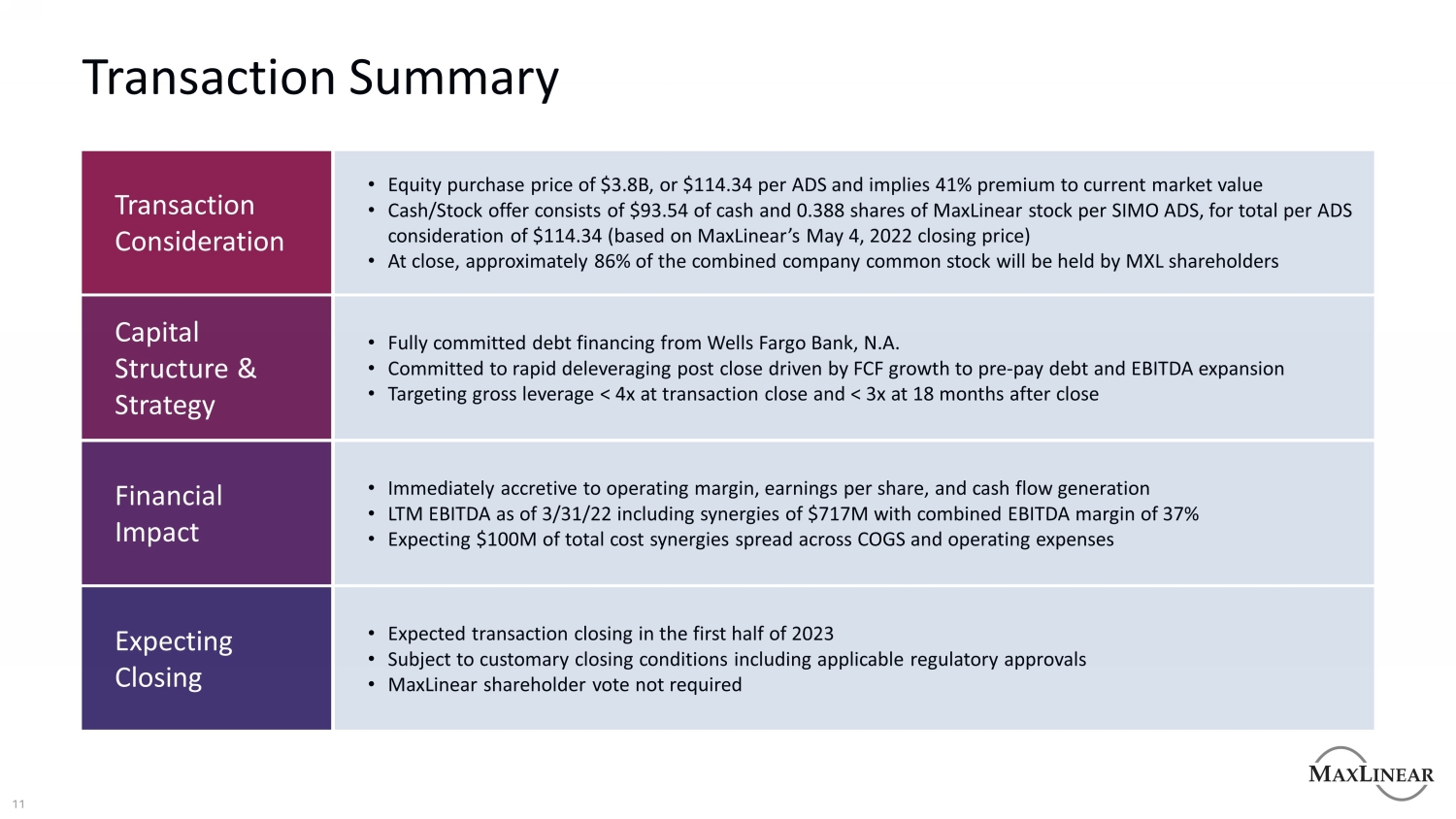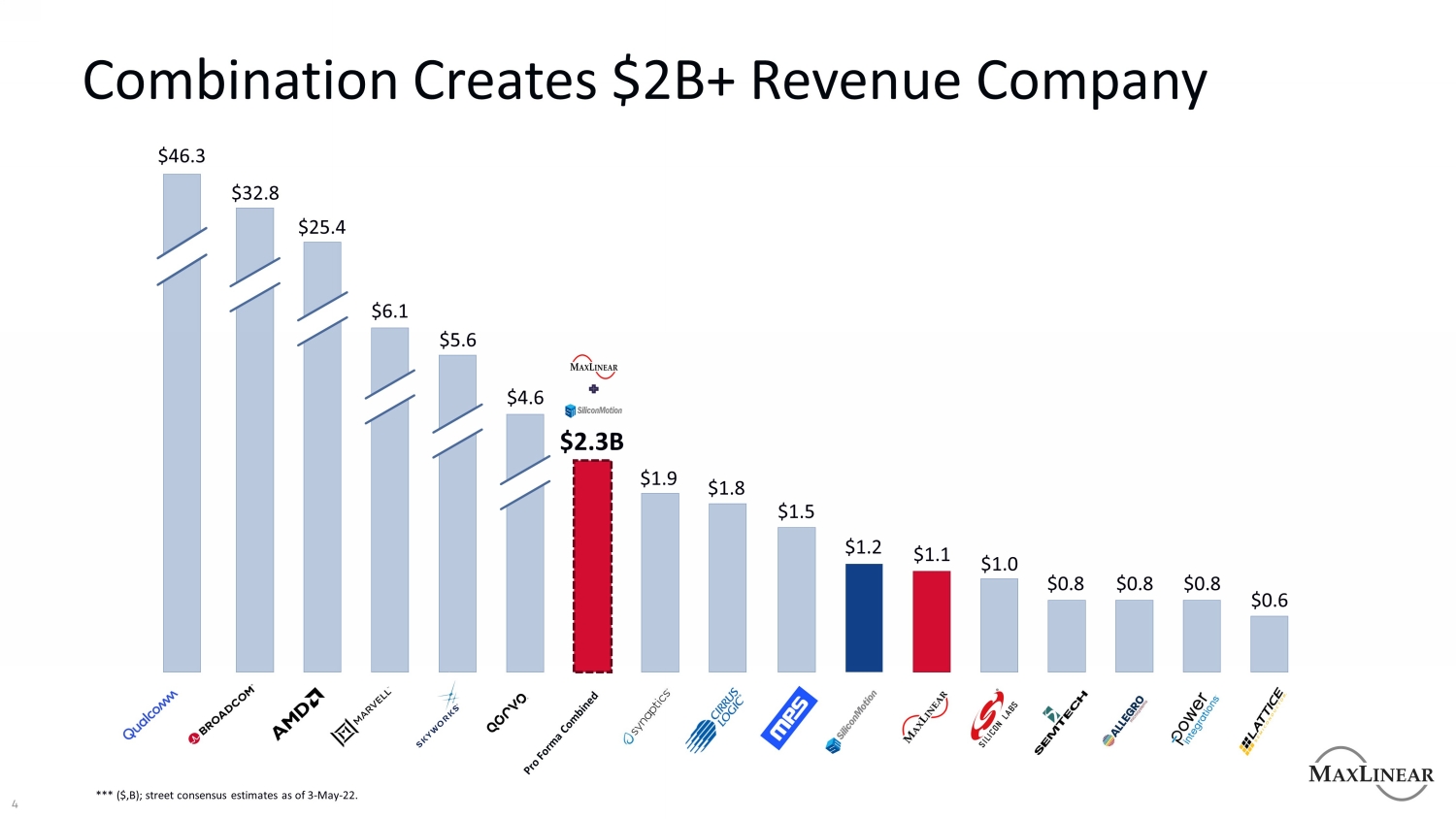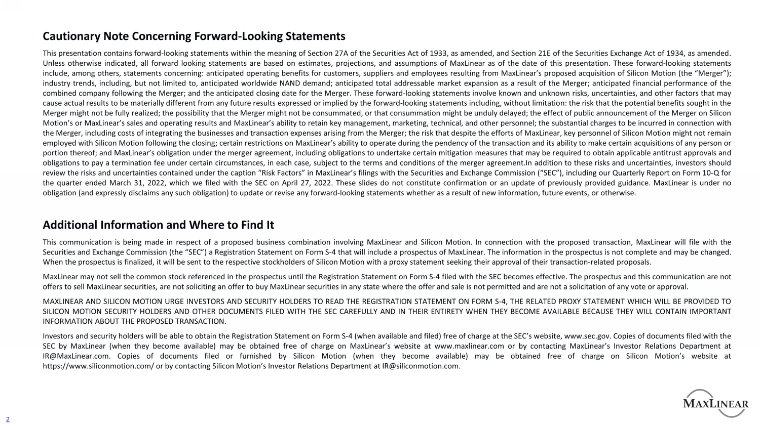 Cautionary Note Concerning Forward - Looking Statements This presentation contains forward - looking statements within the meaning of Section 27 A of the Securities Act of 1933 , as amended, and Section 21 E of the Securities Exchange Act of 1934 , as amended . Unless otherwise indicated, all forward looking statements are based on estimates, projections, and assumptions of MaxLinear as of the date of this presentation . These forward - looking statements include, among others, statements concerning : anticipated operating benefits for customers, suppliers and employees resulting from MaxLinear’s proposed acquisition of Silicon Motion (the “Merger”) ; industry trends, including, but not limited to, anticipated worldwide NAND demand ; anticipated total addressable market expansion as a result of the Merger ; anticipated financial performance of the combined company following the Merger ; and the anticipated closing date for the Merger . These forward - looking statements involve known and unknown risks, uncertainties, and other factors that may cause actual results to be materially different from any future results expressed or implied by the forward - looking statements including, without limitation : the risk that the potential benefits sought in the Merger might not be fully realized ; the possibility that the Merger might not be consummated, or that consummation might be unduly delayed ; the effect of public announcement of the Merger on Silicon Motion’s or MaxLinear’s sales and operating results and MaxLinear’s ability to retain key management, marketing, technical, and other personnel ; the substantial charges to be incurred in connection with the Merger, including costs of integrating the businesses and transaction expenses arising from the Merger ; the risk that despite the efforts of MaxLinear, key personnel of Silicon Motion might not remain employed with Silicon Motion following the closing ; certain restrictions on MaxLinear’s ability to operate during the pendency of the transaction and its ability to make certain acquisitions of any person or portion thereof ; and MaxLinear’s obligation under the merger agreement, including obligations to undertake certain mitigation measures that may be required to obtain applicable antitrust approvals and obligations to pay a termination fee under certain circumstances, in each case, subject to the terms and conditions of the merger agreement . In addition to these risks and uncertainties, investors should review the risks and uncertainties contained under the caption “Risk Factors” in MaxLinear’s filings with the Securities and Exchange Commission (“SEC”), including our Quarterly Report on Form 10 - Q for the quarter ended March 31 , 2022 , which we filed with the SEC on April 27 , 2022 . These slides do not constitute confirmation or an update of previously provided guidance . MaxLinear is under no obligation (and expressly disclaims any such obligation) to update or revise any forward - looking statements whether as a result of new information, future events, or otherwise . Additional Information and Where to Find It This communication is being made in respect of a proposed business combination involving MaxLinear and Silicon Motion . In connection with the proposed transaction, MaxLinear will file with the Securities and Exchange Commission (the “SEC”) a Registration Statement on Form S - 4 that will include a prospectus of MaxLinear . The information in the prospectus is not complete and may be changed . When the prospectus is finalized, it will be sent to the respective stockholders of Silicon Motion with a proxy statement seeking their approval of their transaction - related proposals . MaxLinear may not sell the common stock referenced in the prospectus until the Registration Statement on Form S - 4 filed with the SEC becomes effective . The prospectus and this communication are not offers to sell MaxLinear securities, are not soliciting an offer to buy MaxLinear securities in any state where the offer and sale is not permitted and are not a solicitation of any vote or approval . MAXLINEAR AND SILICON MOTION URGE INVESTORS AND SECURITY HOLDERS TO READ THE REGISTRATION STATEMENT ON FORM S - 4 , THE RELATED PROXY STATEMENT WHICH WILL BE PROVIDED TO SILICON MOTION SECURITY HOLDERS AND OTHER DOCUMENTS FILED WITH THE SEC CAREFULLY AND IN THEIR ENTIRETY WHEN THEY BECOME AVAILABLE BECAUSE THEY WILL CONTAIN IMPORTANT INFORMATION ABOUT THE PROPOSED TRANSACTION . Investors and security holders will be able to obtain the Registration Statement on Form S - 4 (when available and filed) free of charge at the SEC’s website, www . sec . gov . Copies of documents filed with the SEC by MaxLinear (when they become available) may be obtained free of charge on MaxLinear’s website at www . maxlinear . com or by contacting MaxLinear’s Investor Relations Department at IR@MaxLinear . com . Copies of documents filed or furnished by Silicon Motion (when they become available) may be obtained free of charge on Silicon Motion’s website at https : //www . siliconmotion . com/ or by contacting Silicon Motion’s Investor Relations Department at IR@siliconmotion . com . 2