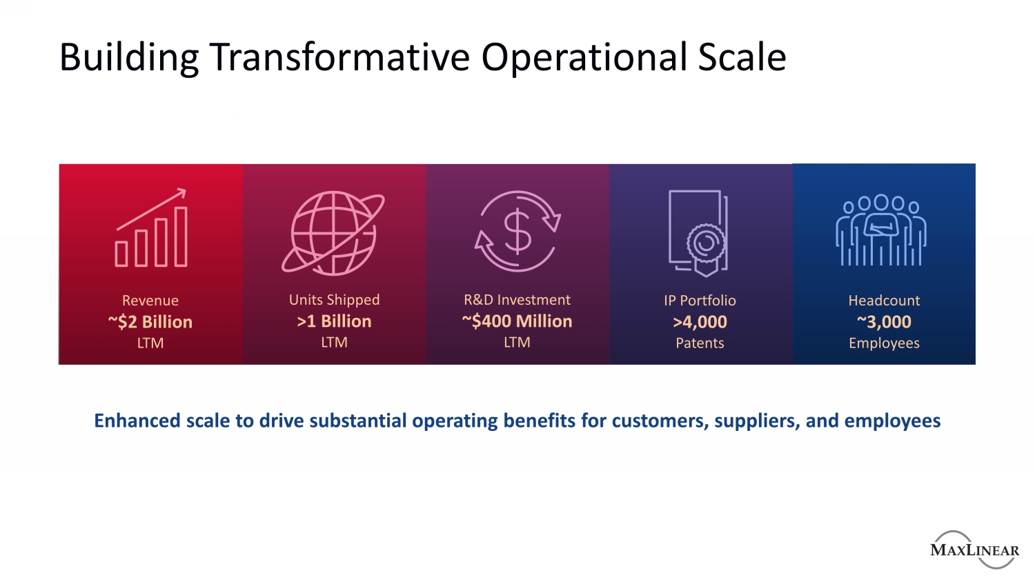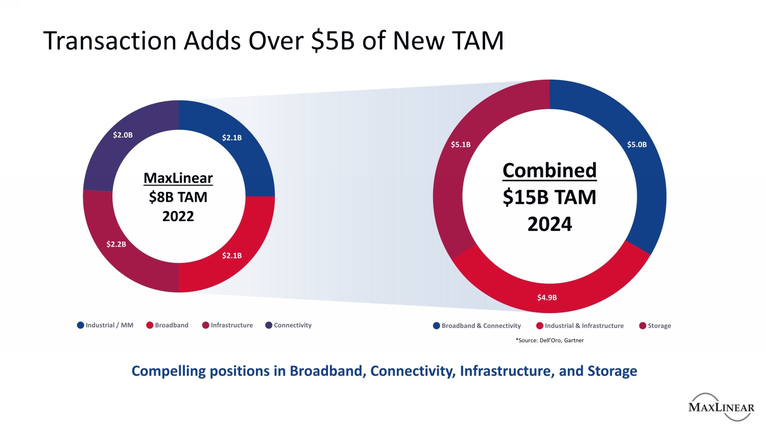 Transaction Adds Over $5B of New TAM MaxLinear $8B TAM 2022 $2.0B $2.1B $2.2B $2.1B Combined $15B TAM 2024 $5.1B $5.0B $4.9B Industrial / MM Broadband Infrastructure Connectivity Broadband & Connectivity Industrial & Infrastructure Storage Compelling positions in Broadband, Connectivity, Infrastructure, and Storage *Source: Dell’Oro, Gartner