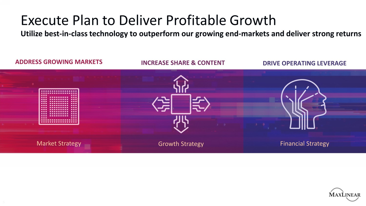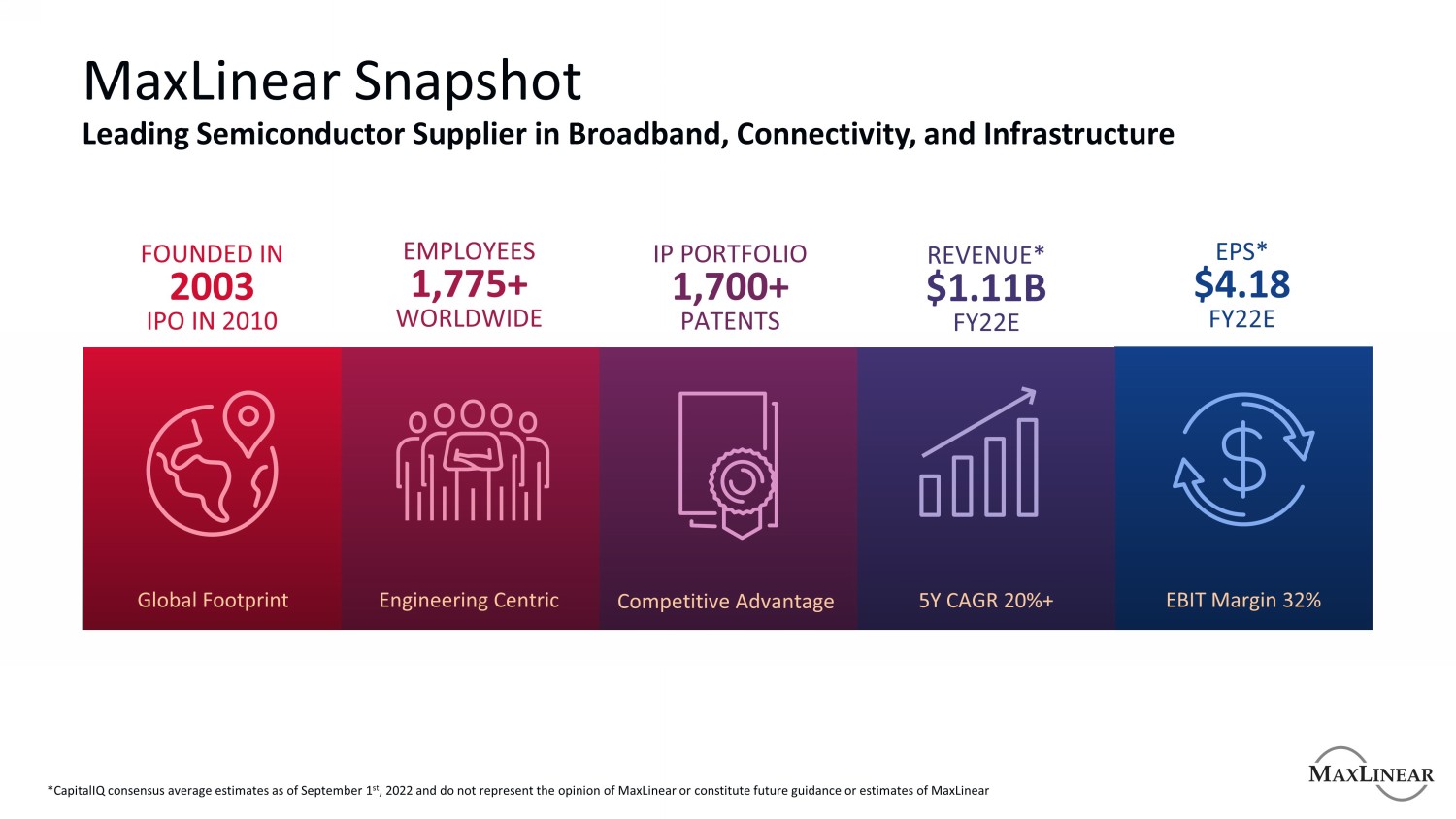 MaxLinear Snapshot Leading Semiconductor Supplier in Broadband, Connectivity, and Infrastructure FOUNDED IN 2003 IPO IN 2010 EMPLOYEES 1,775+ WORLDWIDE IP PORTFOLIO 1,700+ PATENTS REVENUE* $1.11B FY22E EPS* $4.18 FY22E Global Footprint Engineering Centric Competitive Advantage 5Y CAGR 20%+ EBIT Margin 32% *CapitalIQ consensus average estimates as of September 1 st , 2022 and do not represent the opinion of MaxLinear or constitute future guidance or estimates of MaxLinear