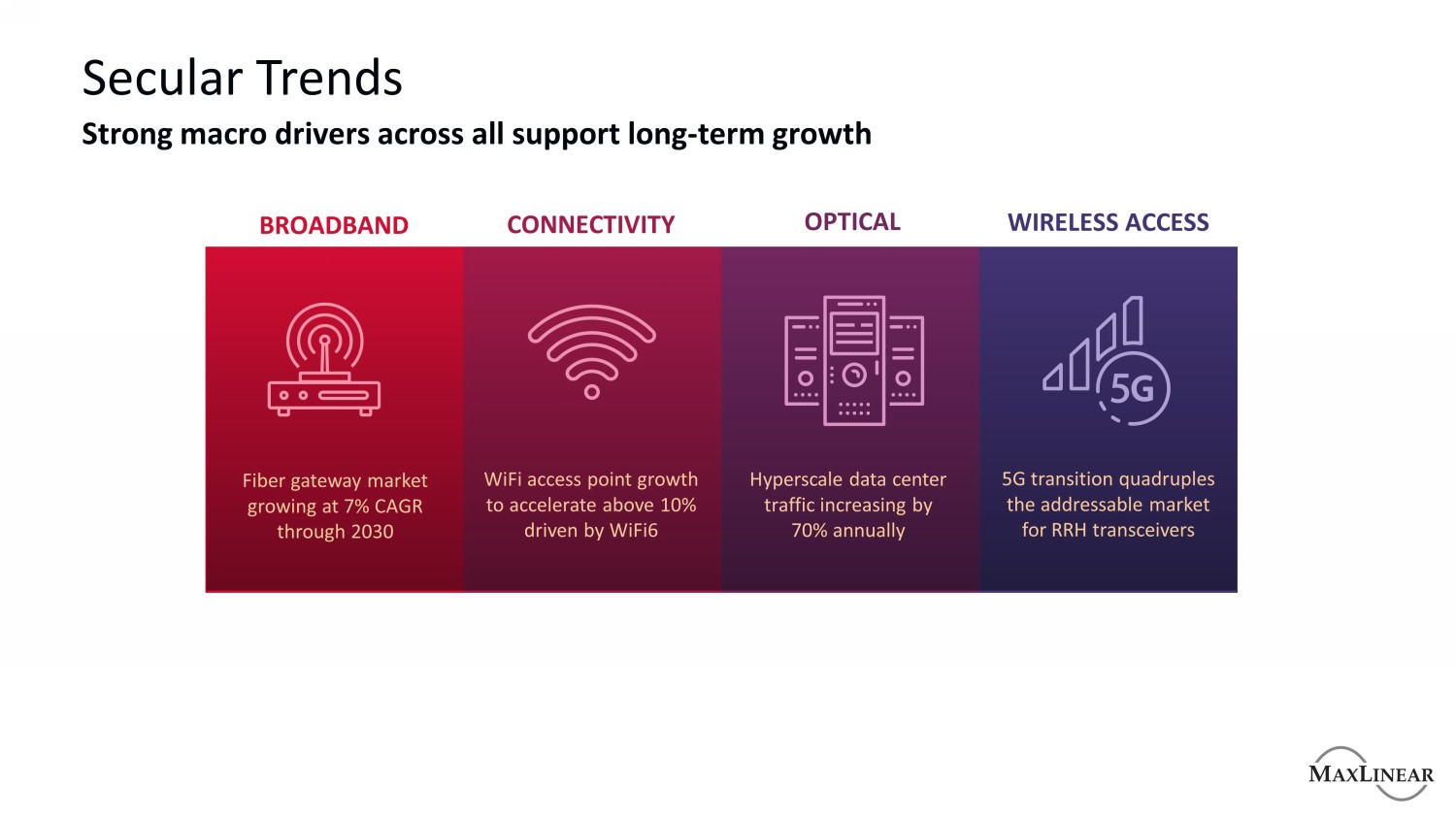 Secular Trends Strong macro drivers across all support long - term growth BROADBAND CONNECTIVITY OPTICAL WIRELESS ACCESS Fiber gateway market growing at 7% CAGR through 2030 WiFi access point growth to accelerate above 10% driven by WiFi6 Hyperscale data center traffic increasing by 70% annually 5G transition quadruples the addressable market for RRH transceivers