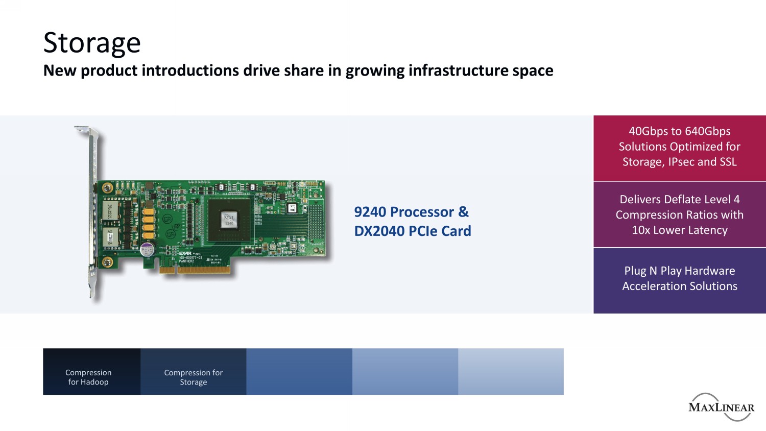 Storage New product introductions drive share in growing infrastructure space Compression for Hadoop Compression for Storage 40Gbps to 640Gbps Solutions Optimized for Storage, IPsec and SSL Delivers Deflate Level 4 Compression Ratios with 10x Lower Latency Plug N Play Hardware Acceleration Solutions 9240 Processor & DX2040 PCIe Card