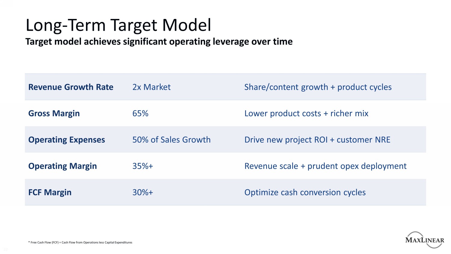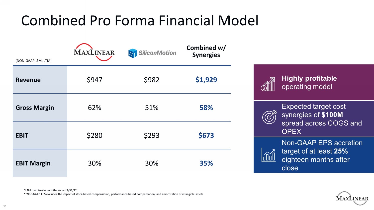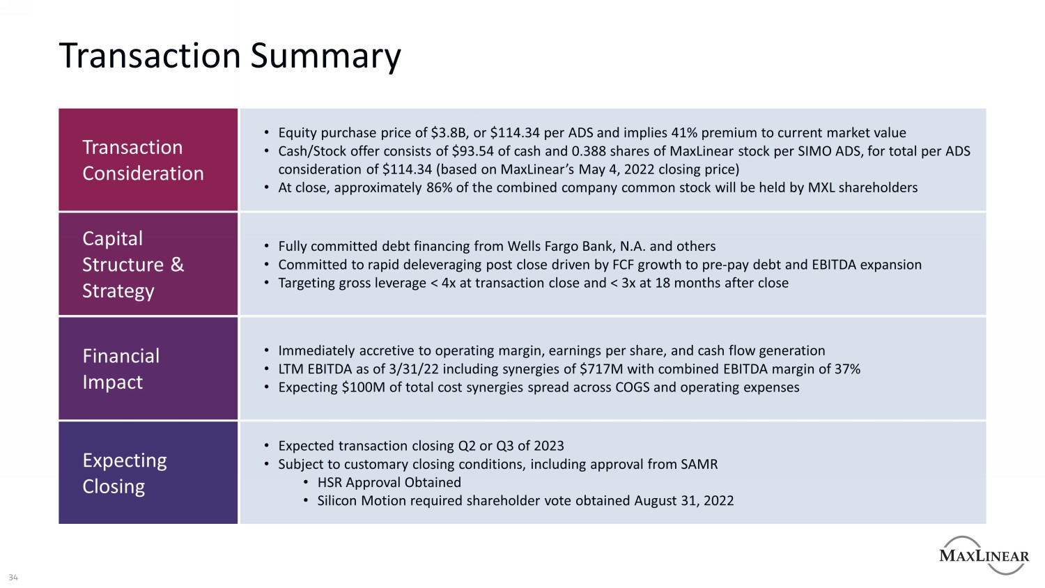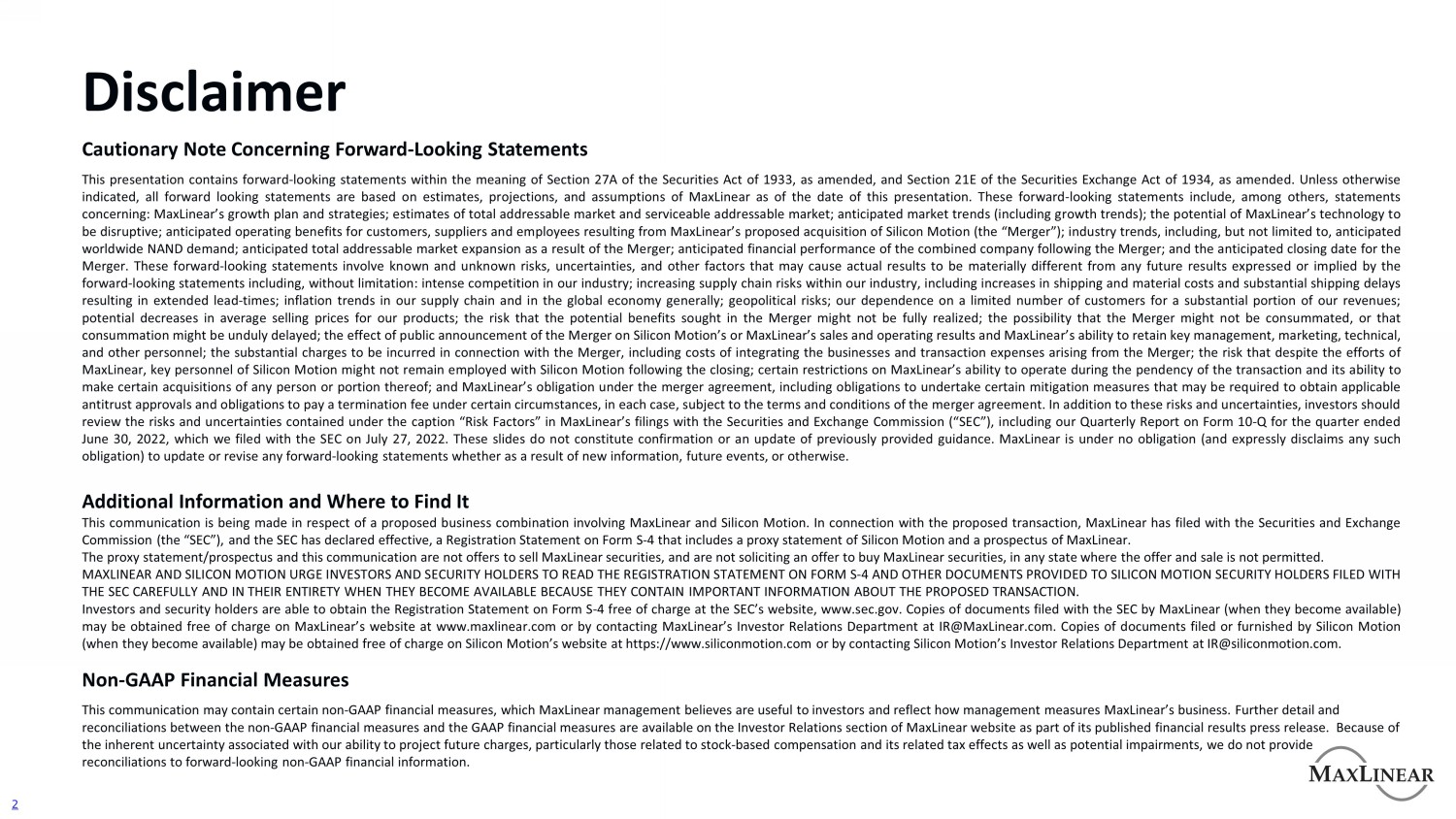 Disclaimer Cautionary Note Concerning Forward - Looking Statements This presentation contains forward - looking statements within the meaning of Section 27 A of the Securities Act of 1933 , as amended, and Section 21 E of the Securities Exchange Act of 1934 , as amended . Unless otherwise indicated, all forward looking statements are based on estimates, projections, and assumptions of MaxLinear as of the date of this presentation . These forward - looking statements include, among others, statements concerning : MaxLinear’s growth plan and strategies ; estimates of total addressable market and serviceable addressable market ; anticipated market trends (including growth trends) ; the potential of MaxLinear’s technology to be disruptive ; anticipated operating benefits for customers, suppliers and employees resulting from MaxLinear’s proposed acquisition of Silicon Motion (the “Merger”) ; industry trends, including, but not limited to, anticipated worldwide NAND demand ; anticipated total addressable market expansion as a result of the Merger ; anticipated financial performance of the combined company following the Merger ; and the anticipated closing date for the Merger . These forward - looking statements involve known and unknown risks, uncertainties, and other factors that may cause actual results to be materially different from any future results expressed or implied by the forward - looking statements including, without limitation : intense competition in our industry ; increasing supply chain risks within our industry, including increases in shipping and material costs and substantial shipping delays resulting in extended lead - times ; inflation trends in our supply chain and in the global economy generally ; geopolitical risks ; our dependence on a limited number of customers for a substantial portion of our revenues ; potential decreases in average selling prices for our products ; the risk that the potential benefits sought in the Merger might not be fully realized ; the possibility that the Merger might not be consummated, or that consummation might be unduly delayed ; the effect of public announcement of the Merger on Silicon Motion’s or MaxLinear’s sales and operating results and MaxLinear’s ability to retain key management, marketing, technical, and other personnel ; the substantial charges to be incurred in connection with the Merger, including costs of integrating the businesses and transaction expenses arising from the Merger ; the risk that despite the efforts of MaxLinear, key personnel of Silicon Motion might not remain employed with Silicon Motion following the closing ; certain restrictions on MaxLinear’s ability to operate during the pendency of the transaction and its ability to make certain acquisitions of any person or portion thereof ; and MaxLinear’s obligation under the merger agreement, including obligations to undertake certain mitigation measures that may be required to obtain applicable antitrust approvals and obligations to pay a termination fee under certain circumstances, in each case, subject to the terms and conditions of the merger agreement . In addition to these risks and uncertainties, investors should review the risks and uncertainties contained under the caption “Risk Factors” in MaxLinear’s filings with the Securities and Exchange Commission (“SEC”), including our Quarterly Report on Form 10 - Q for the quarter ended June 30 , 2022 , which we filed with the SEC on July 27 , 2022 . These slides do not constitute confirmation or an update of previously provided guidance . MaxLinear is under no obligation (and expressly disclaims any such obligation) to update or revise any forward - looking statements whether as a result of new information, future events, or otherwise . Additional Information and Where to Find It This communication is being made in respect of a proposed business combination involving MaxLinear and Silicon Motion . In connection with the proposed transaction, MaxLinear has filed with the Securities and Exchange Commission (the “SEC”), and the SEC has declared effective, a Registration Statement on Form S - 4 that includes a proxy statement of Silicon Motion and a prospectus of MaxLinear . The proxy statement/prospectus and this communication are not offers to sell MaxLinear securities, and are not soliciting an offer to buy MaxLinear securities, in any state where the offer and sale is not permitted . MAXLINEAR AND SILICON MOTION URGE INVESTORS AND SECURITY HOLDERS TO READ THE REGISTRATION STATEMENT ON FORM S - 4 AND OTHER DOCUMENTS PROVIDED TO SILICON MOTION SECURITY HOLDERS FILED WITH THE SEC CAREFULLY AND IN THEIR ENTIRETY WHEN THEY BECOME AVAILABLE BECAUSE THEY CONTAIN IMPORTANT INFORMATION ABOUT THE PROPOSED TRANSACTION . Investors and security holders are able to obtain the Registration Statement on Form S - 4 free of charge at the SEC’s website, www . sec . gov . Copies of documents filed with the SEC by MaxLinear (when they become available) may be obtained free of charge on MaxLinear’s website at www . maxlinear . com or by contacting MaxLinear’s Investor Relations Department at IR@MaxLinear . com . Copies of documents filed or furnished by Silicon Motion (when they become available) may be obtained free of charge on Silicon Motion’s website at https : //www . siliconmotion . com or by contacting Silicon Motion’s Investor Relations Department at IR@siliconmotion . com . Non - GAAP Financial Measures This communication may contain certain non - GAAP financial measures, which MaxLinear management believes are useful to investors and reflect how management measures MaxLinear’s business. Further detail and reconciliations between the non - GAAP financial measures and the GAAP financial measures are available on the Investor Relations section of MaxLinear website as part of its published financial results press release. Because of the inherent uncertainty associated with our abilit