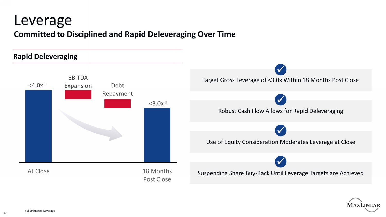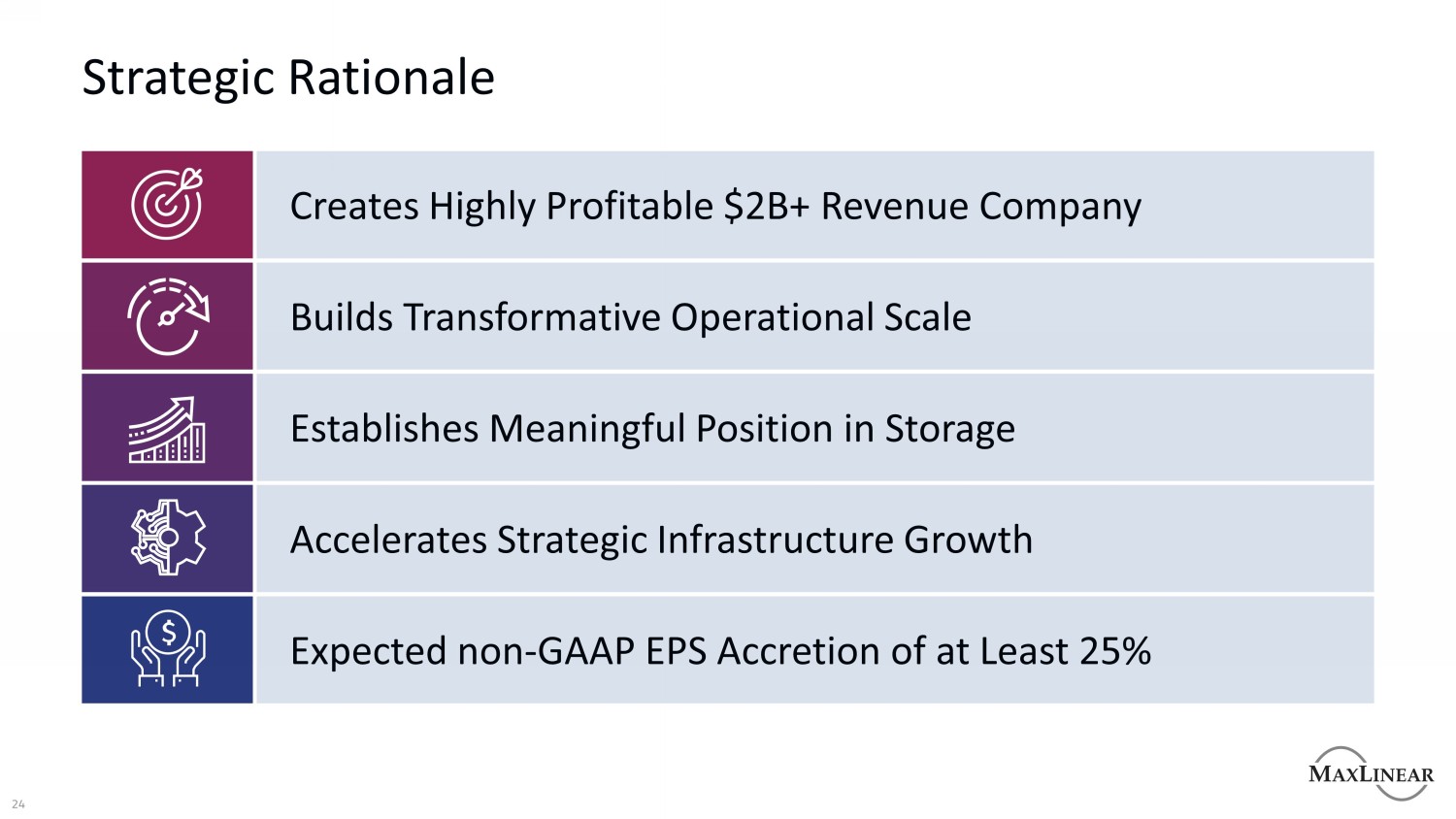 Transaction Adds Over $5B of New TAM MaxLinear $8B TAM 2022 $2.0B $2.1B $2.2B $2.1B Combined $15B TAM 2024 $5.1B $5.0B $4.9B Industrial / MM Broadband Infrastructure Connectivity Broadband & Connectivity Industrial & Infrastructure Storage Compelling positions in Broadband, Connectivity, Infrastructure, and Storage *Source: Dell’Oro, Gartner