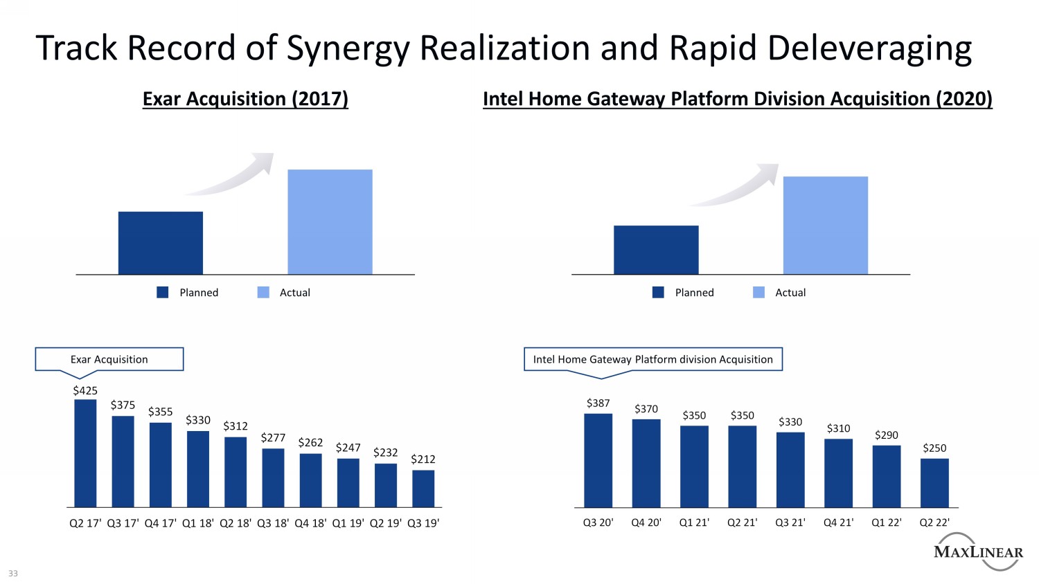 $387 $370 $350 $350 $330 $310 $290 $250 Q3 20' Q4 20' Q1 21' Q2 21' Q3 21' Q4 21' Q1 22' Q2 22' $425 $375 $355 $330 $312 $277 $262 $247 $232 $212 Q2 17' Q3 17' Q4 17' Q1 18' Q2 18' Q3 18' Q4 18' Q1 19' Q2 19' Q3 19' Track Record of Synergy Realization and Rapid Deleveraging Exar Acquisition Intel Home Gateway Platform division Acquisition Exar Acquisition (2017) Intel Home Gateway Platform Division Acquisition (2020) Planned Actual Planned Actual 33